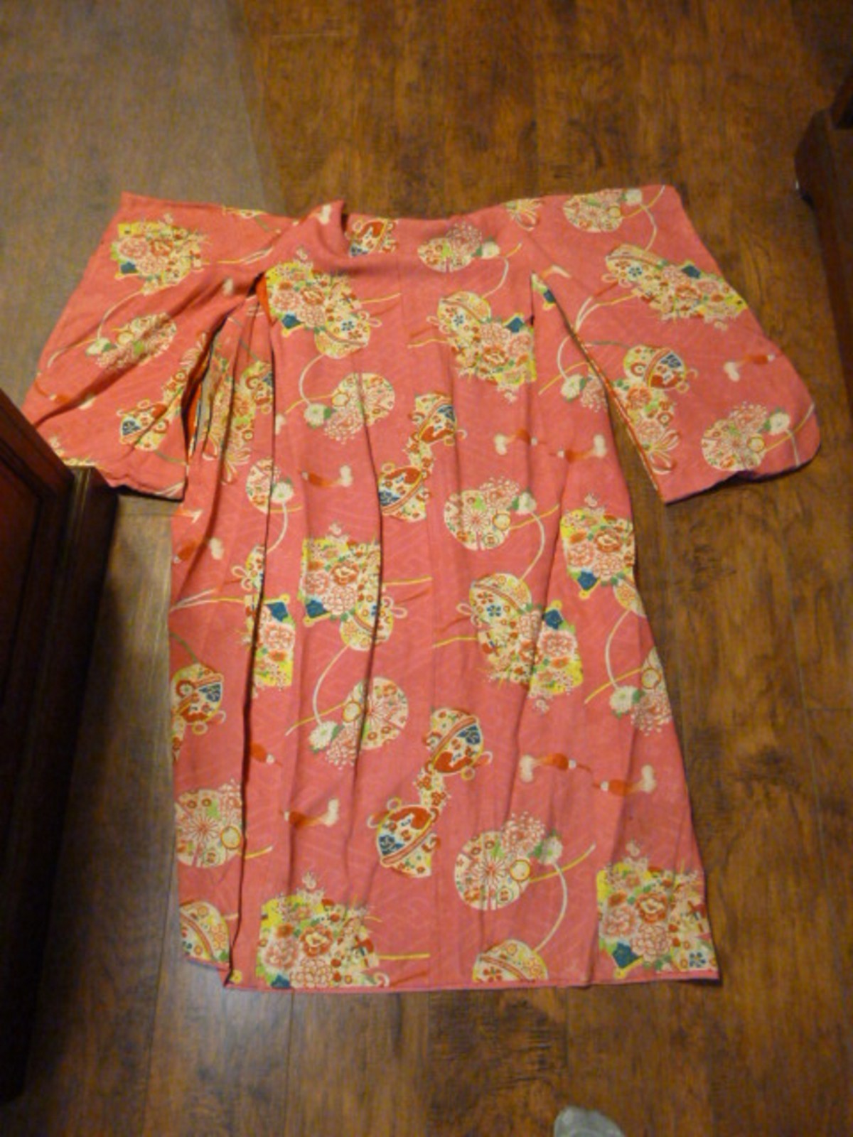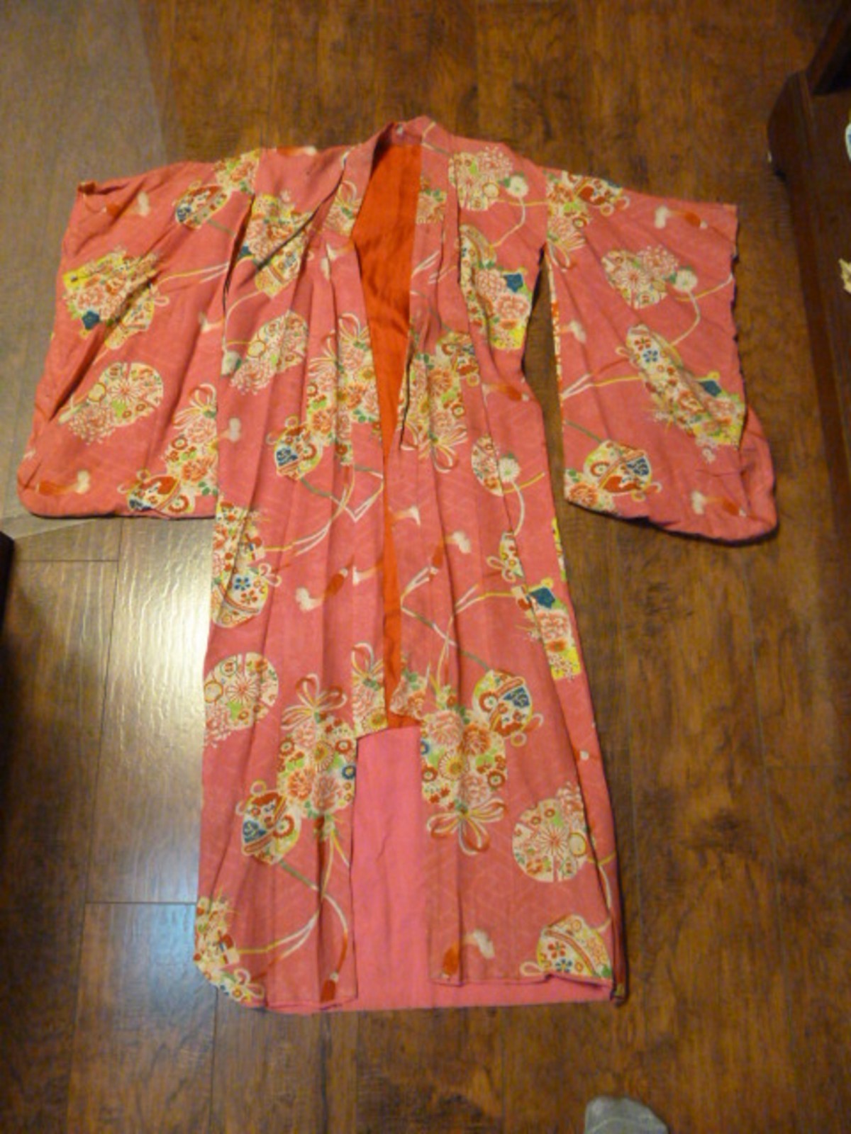 CL-KIM-8 Pre WWII vintage long multicolor pink red floral design Kimono Small