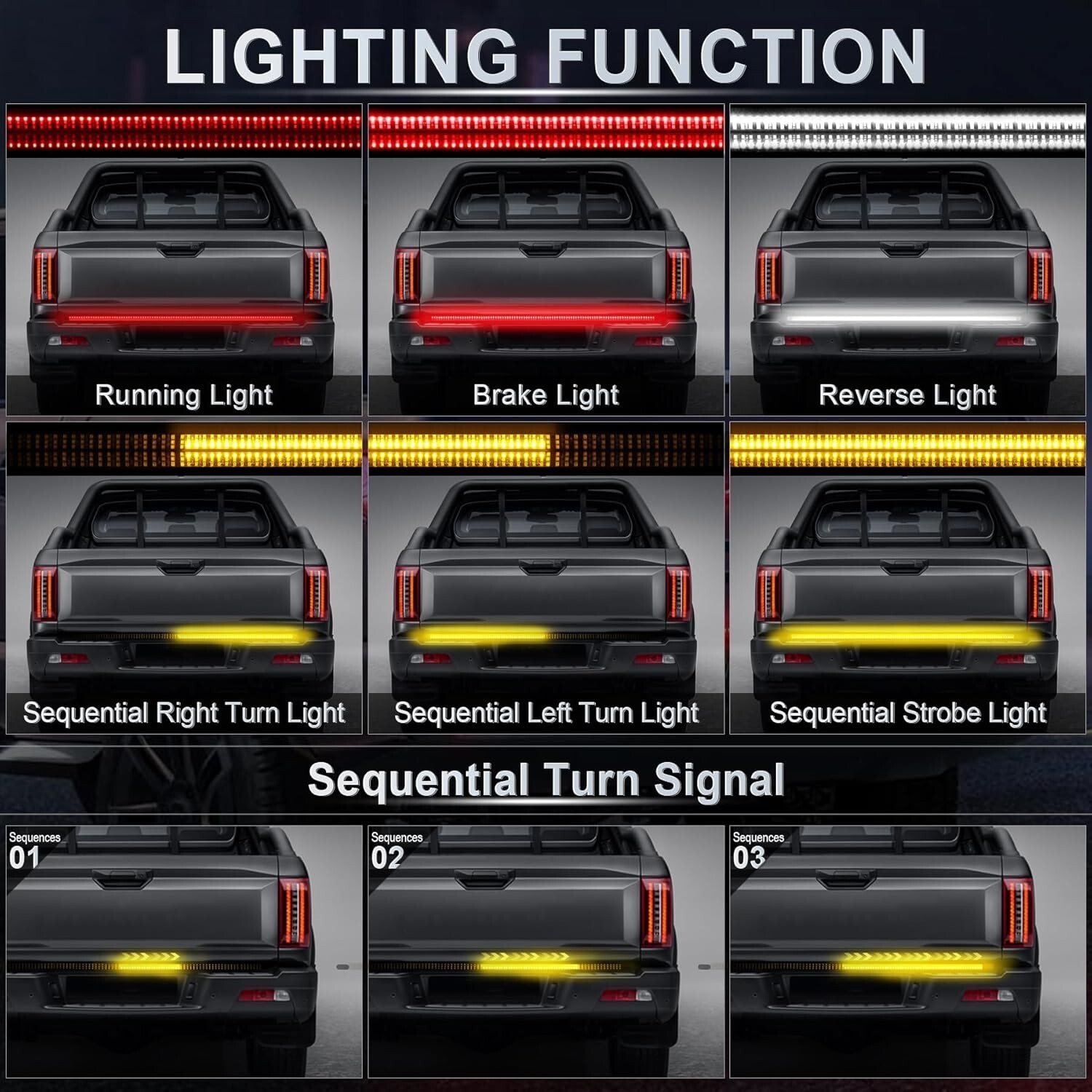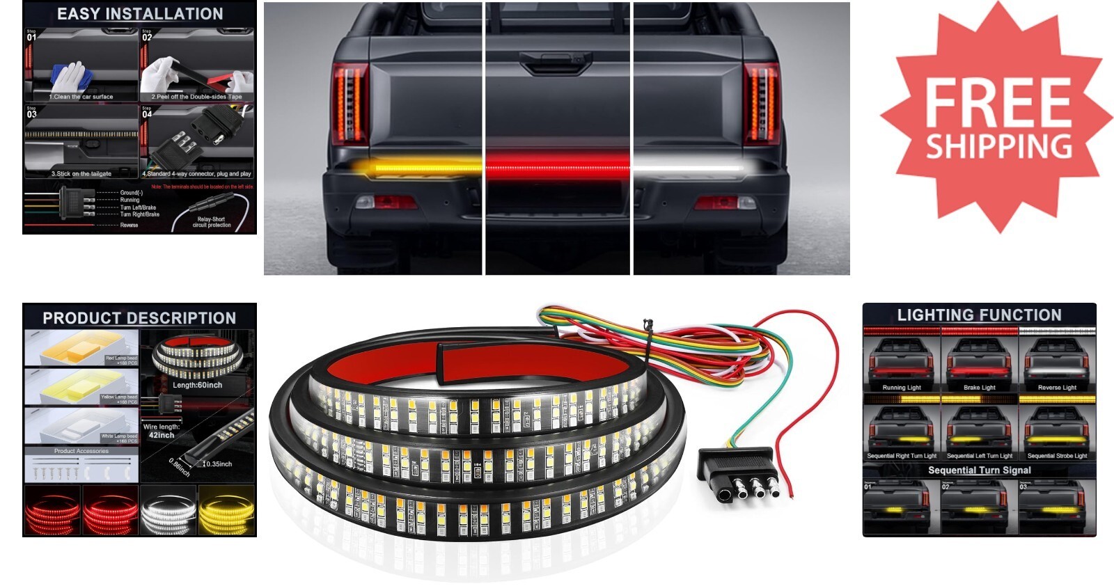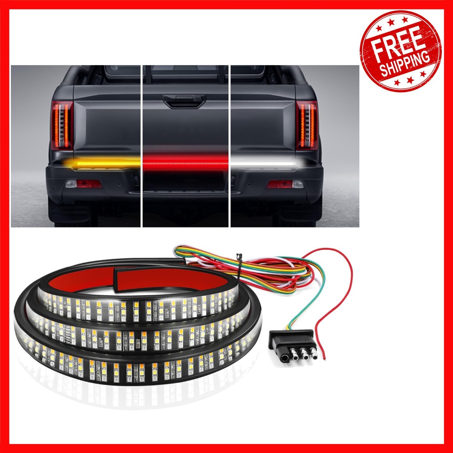 All-Weather 60" Truck LED Tailgate Light Bar - Red/Amber/White with Adhesive Fit