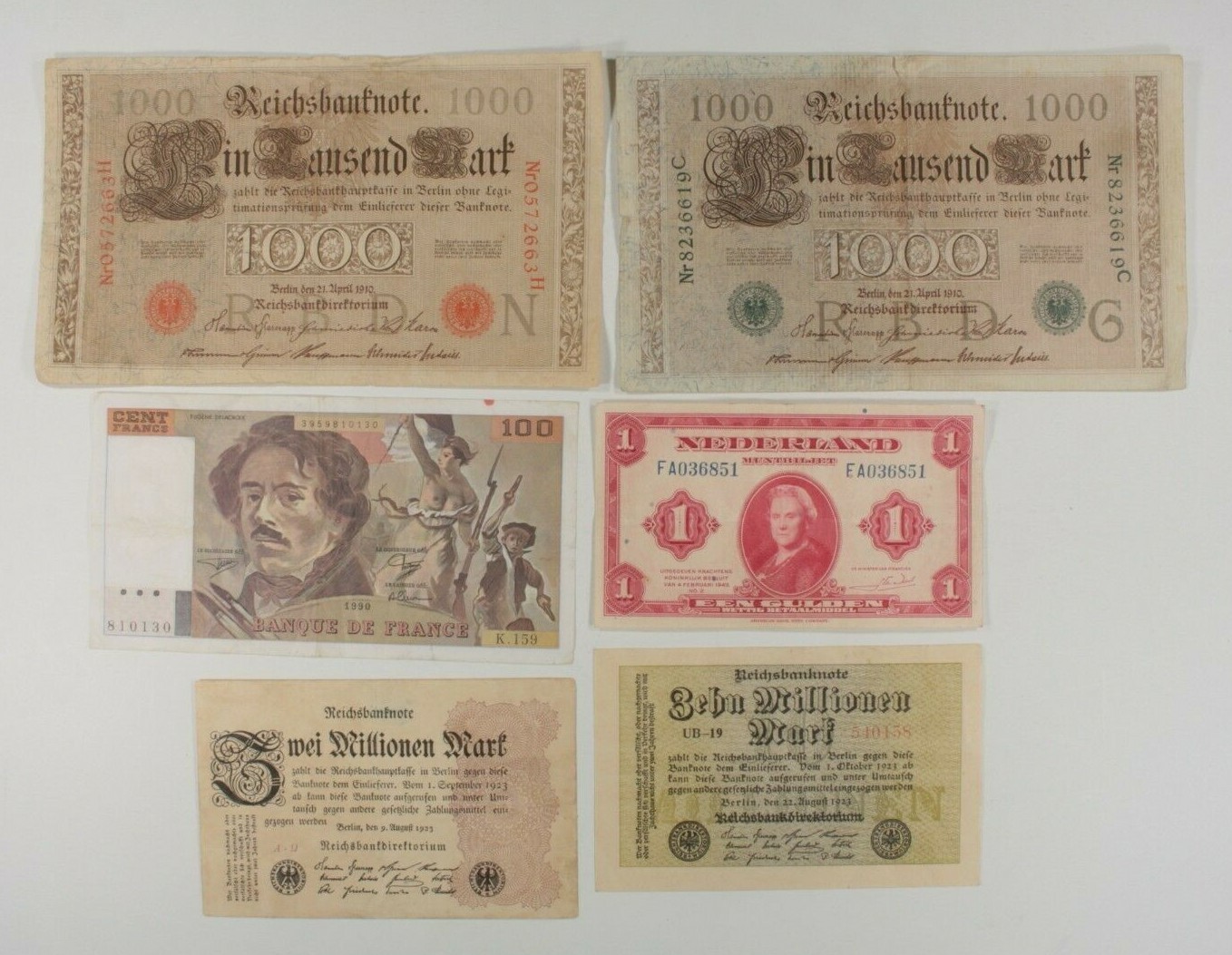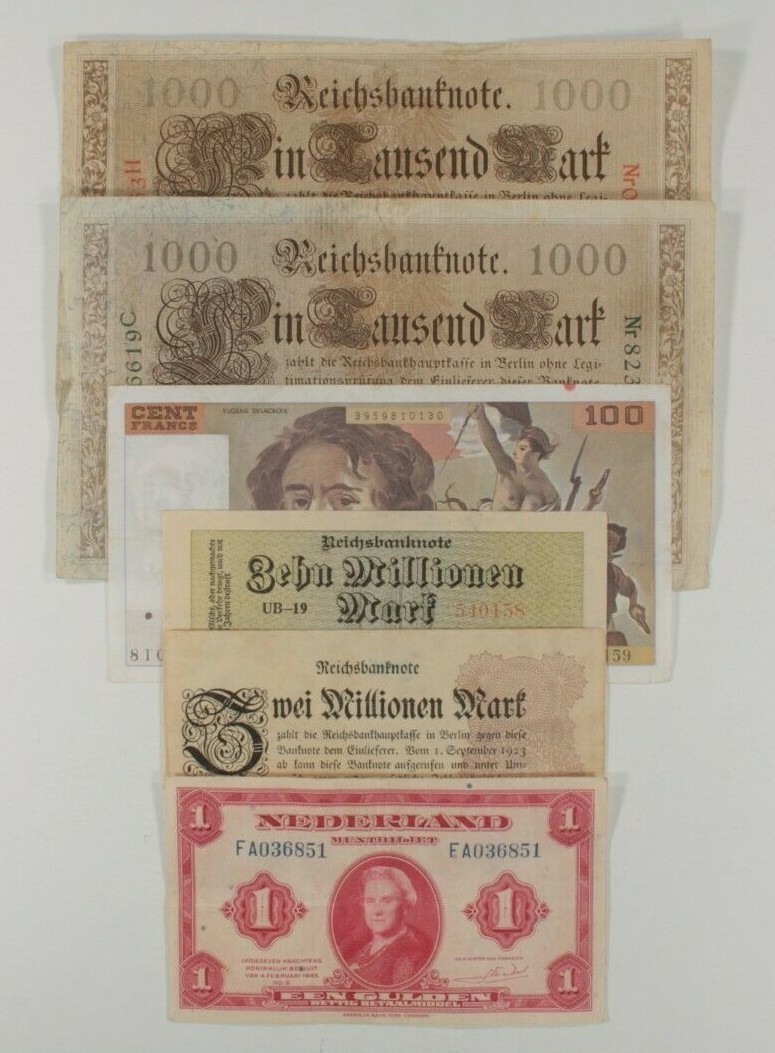 1910-1990 Germany, France Netherlands 6-Note Currency Set Mark Franc Gulden