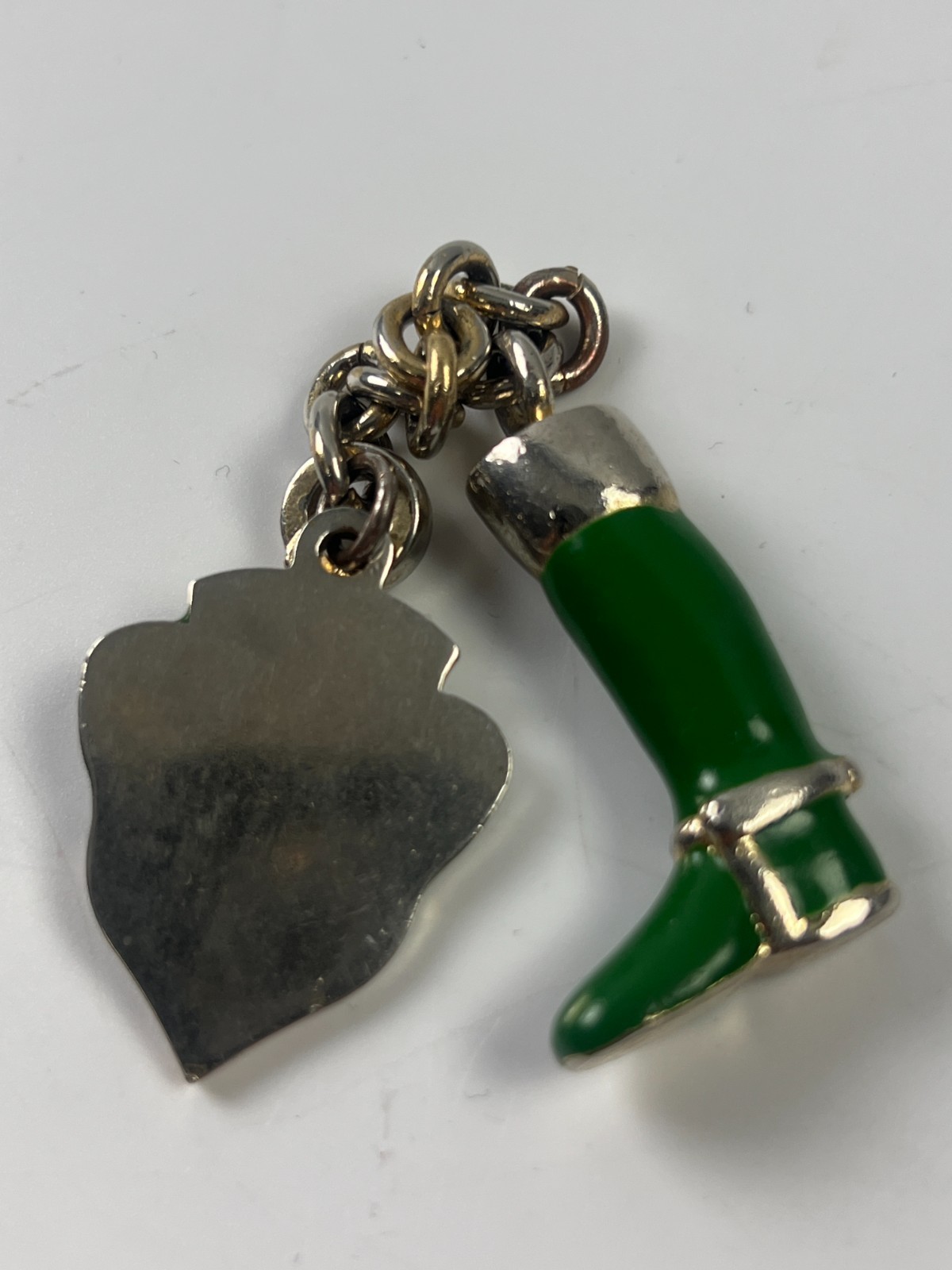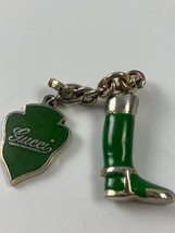The product is a Gucci Key Chain Boot Bag Charm in green and gold, designed for women who appreciate high-end fashion accessories. The charm features a metal material with a stylish design inspired by boots, making it a unique and eye-catching addition to any key chain collection. Unfortunately, it does not come with a clip, but this can easily be remedied by adding one to the charm for convenience and functionality.