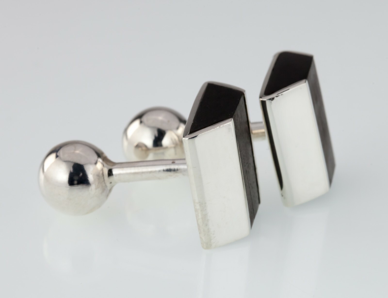 Feature Trapezoidal Dark Wood Elements in Sterling Silver Settings