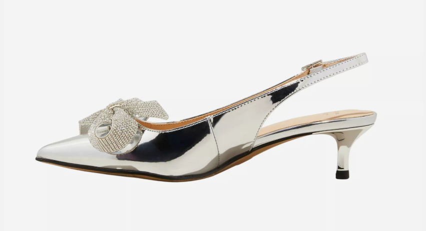 Treten Sie in glamourosem Stil mit diesen Priscilla Bogen Slingback Kitten Heels von einem neuen Tag aus. Diese silbernen Absatze verfügen über einen geschlossenen, spitzem Vamp, der mit einem voluminosen 3D-Bogen verziert ist, der mit funkelnden Glasperlen verschonert ist, um einen herausragenden Look zu erhalten. Die Sandalen auf einer zwei Zoll großen Louis-Ferse verfügen über eine gepolsterte Innensohle und eine bequeme Futter. Außerdem haben sie eine luftige Slingback -Silhouette mit einem eleganten Riemen und einem verstellbaren Schnallenverschluss.