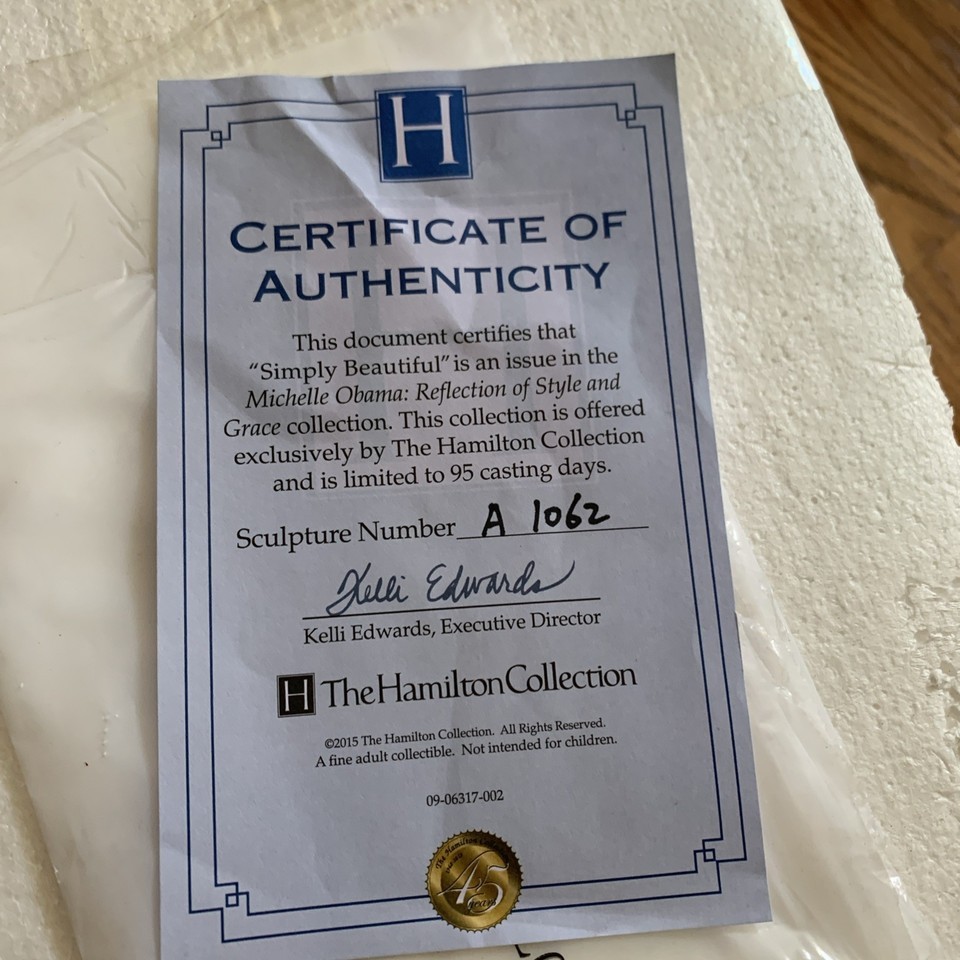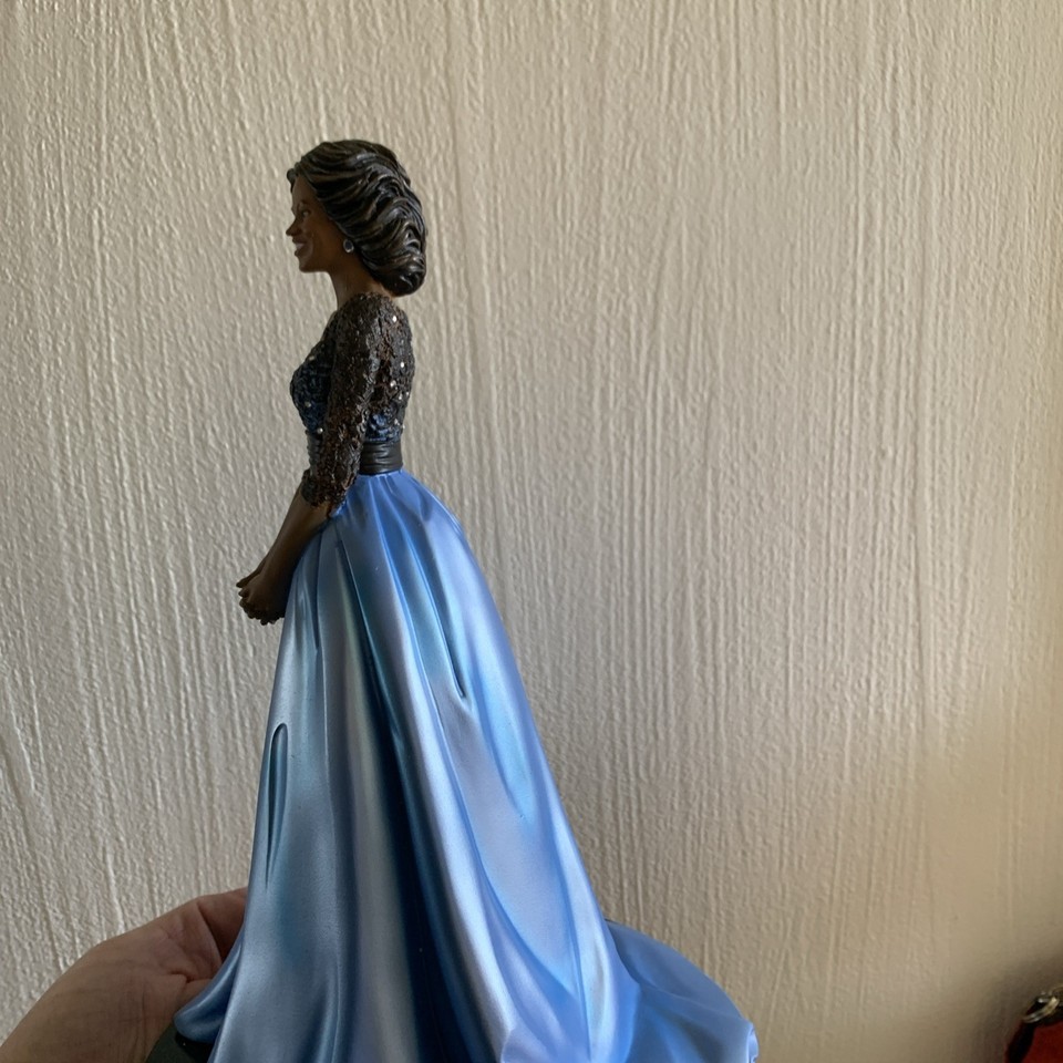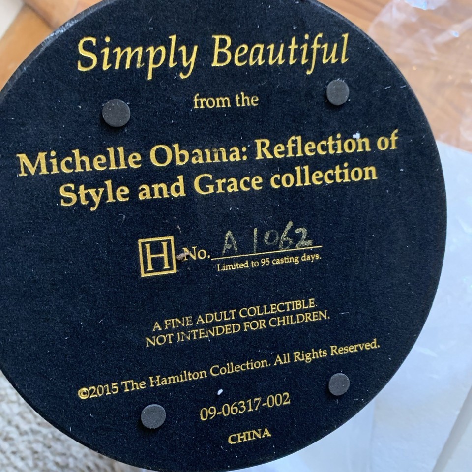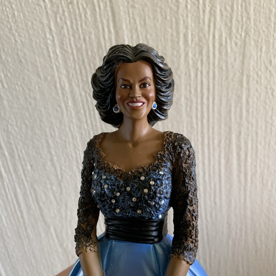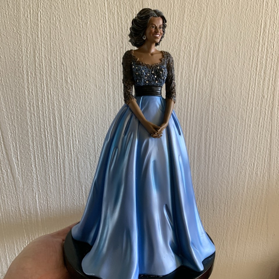 The Hamilton Simply Beautiful Michelle Obama Reflection of Style and Grace figurine is a licensed reproduction from The Hamilton Collection, manufactured in 2015. This collectible piece portrays Michelle Obama in a stunning blue color, reflecting her style and grace. It is a part of the Michelle Obama: A Reflection of Style and Grace collection, featuring themes of beauty, politics, and the Obama presidency. This figurine is perfect for adults who appreciate decorative collectibles related to First Ladies and iconic figures like Michelle Obama.