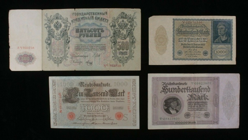 Germany & Russia 4-Notes Lot Large-Size German Mark & Russian Rubles- show or...
