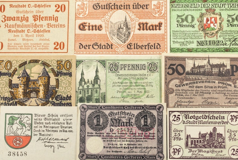 Ce lot comprendra 25 notes de notgeld individuelles d'Allemagne apres la Premiere Guerre mondiale. Valeurs faciales entre 5 pfennig a 5 marque.