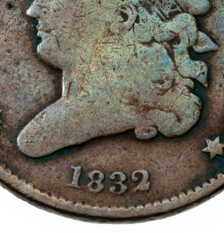 1832 Classic Head 1 / 2c Half Cent sur bon Ag bon en usure, obv a la couleur "off"
