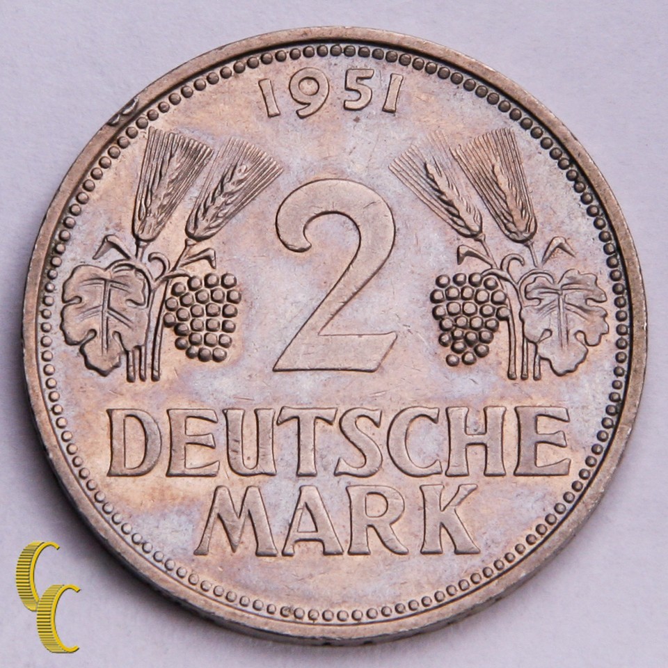 1951-F Germany Deutsche 2 Mark 1 Year Issue (XF) Extra Fine Condition- show o...