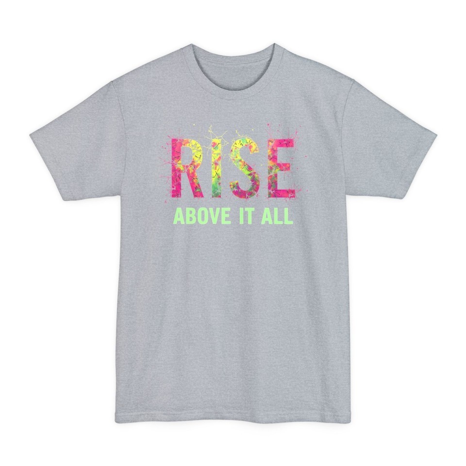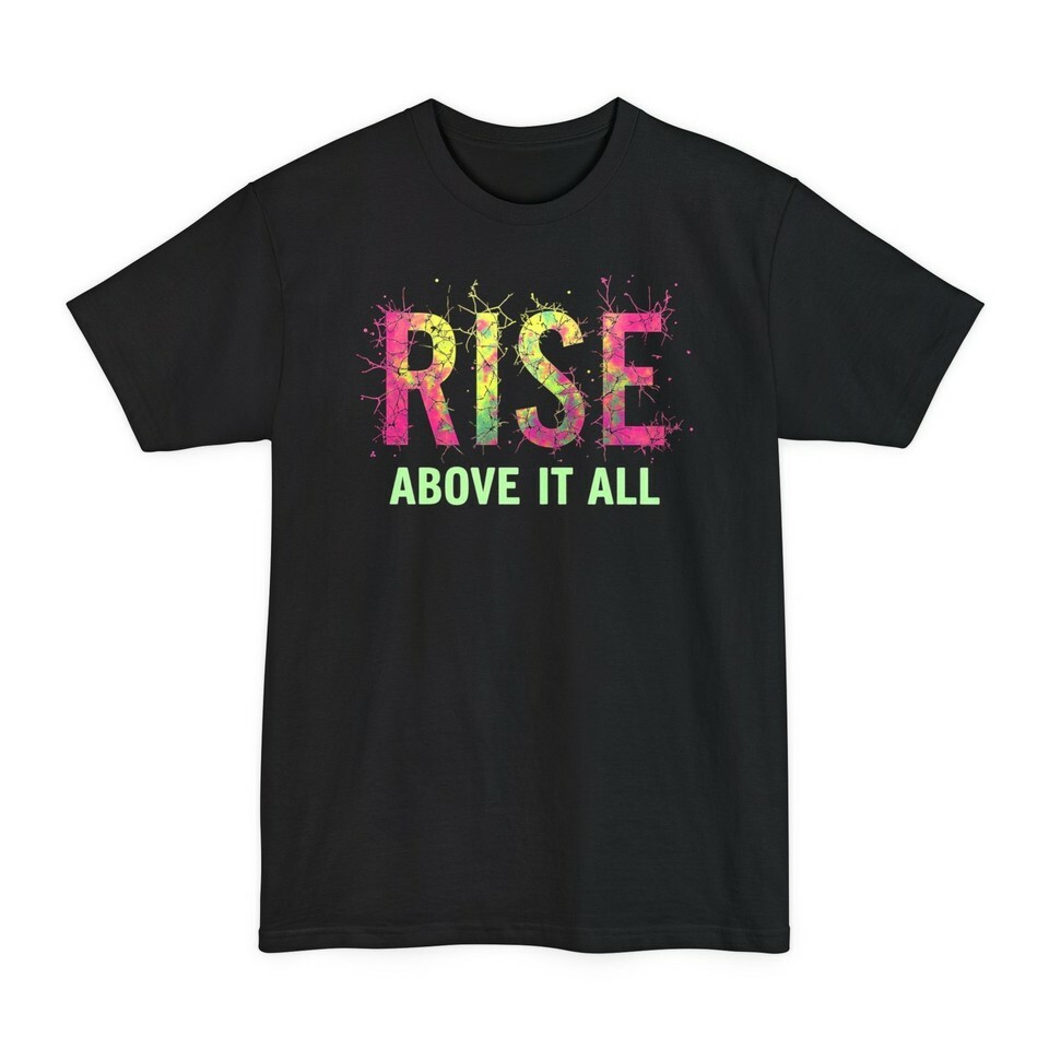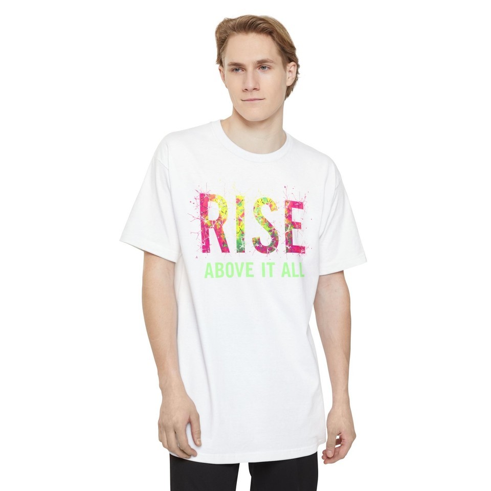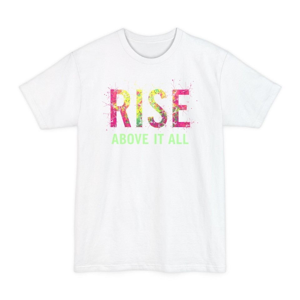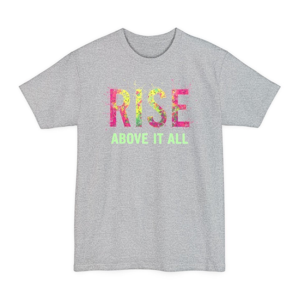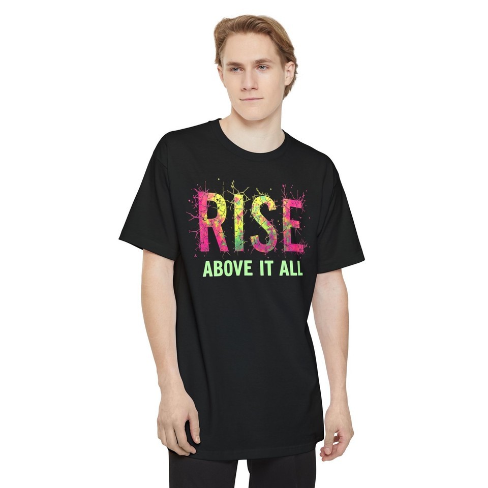 A 'Rise Above It All, I did' t-shirt designed for tall people, featuring a longer body and sleeves. Perfect for tall individuals looking for comfortable and durable attire. Ideal for everyday wear and casual outings, relevant for tall individuals who value quality clothing.