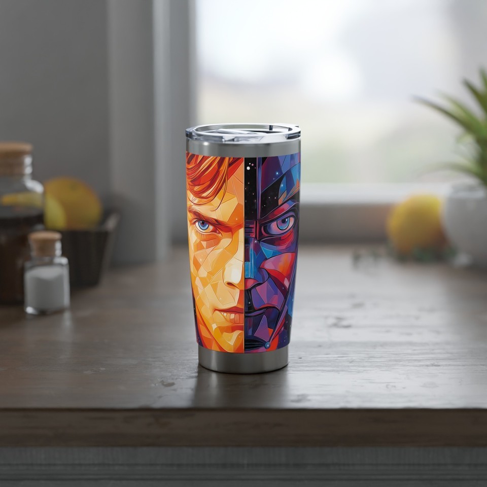This 20 oz tumbler features a split screen design of young Annikan Skywalker and Darth Vader, giving off a nostalgic and cinematic vibe. Perfect for Star Wars fans looking to enjoy their favorite beverages in style. Ideal for gifting on birthdays, holidays, and special occasions.