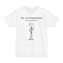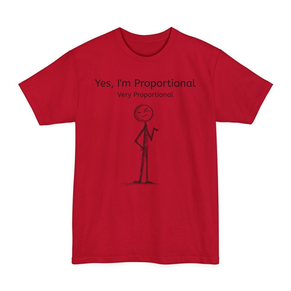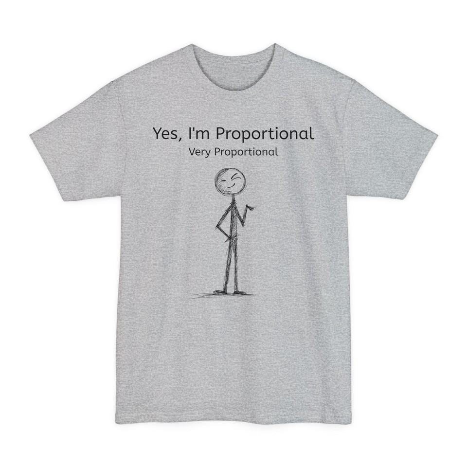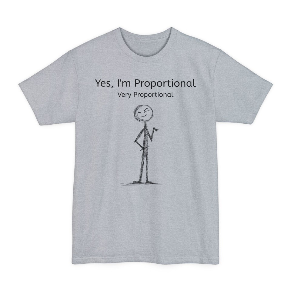 Casual and fun t-shirt designed for tall guys with a stick figure that reads 'Yes I'm Proportional'. Perfect for everyday wear and great for adding a touch of humor to the wardrobe. Ideal for tall men looking for a comfortable and stylish tee.