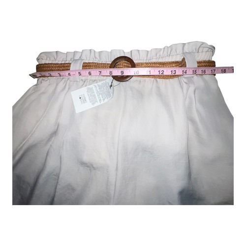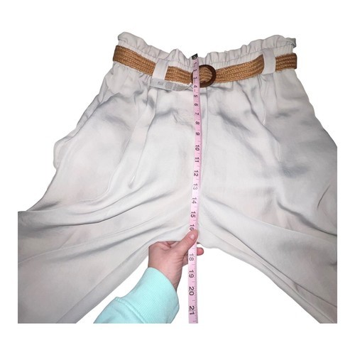 Introducing the ZARA Tan High Waist Paperbag Cropped Pants Brown Raffia Belt Women Size XXL, perfect for any occasion from casual to business wear. These stylish pants feature a solid pattern with a zip and button closure, making them comfortable to wear. The pants are made of high-quality polyester material and have pleated accents, ruffle detailing, and a high rise of greater than 10.5 inches.