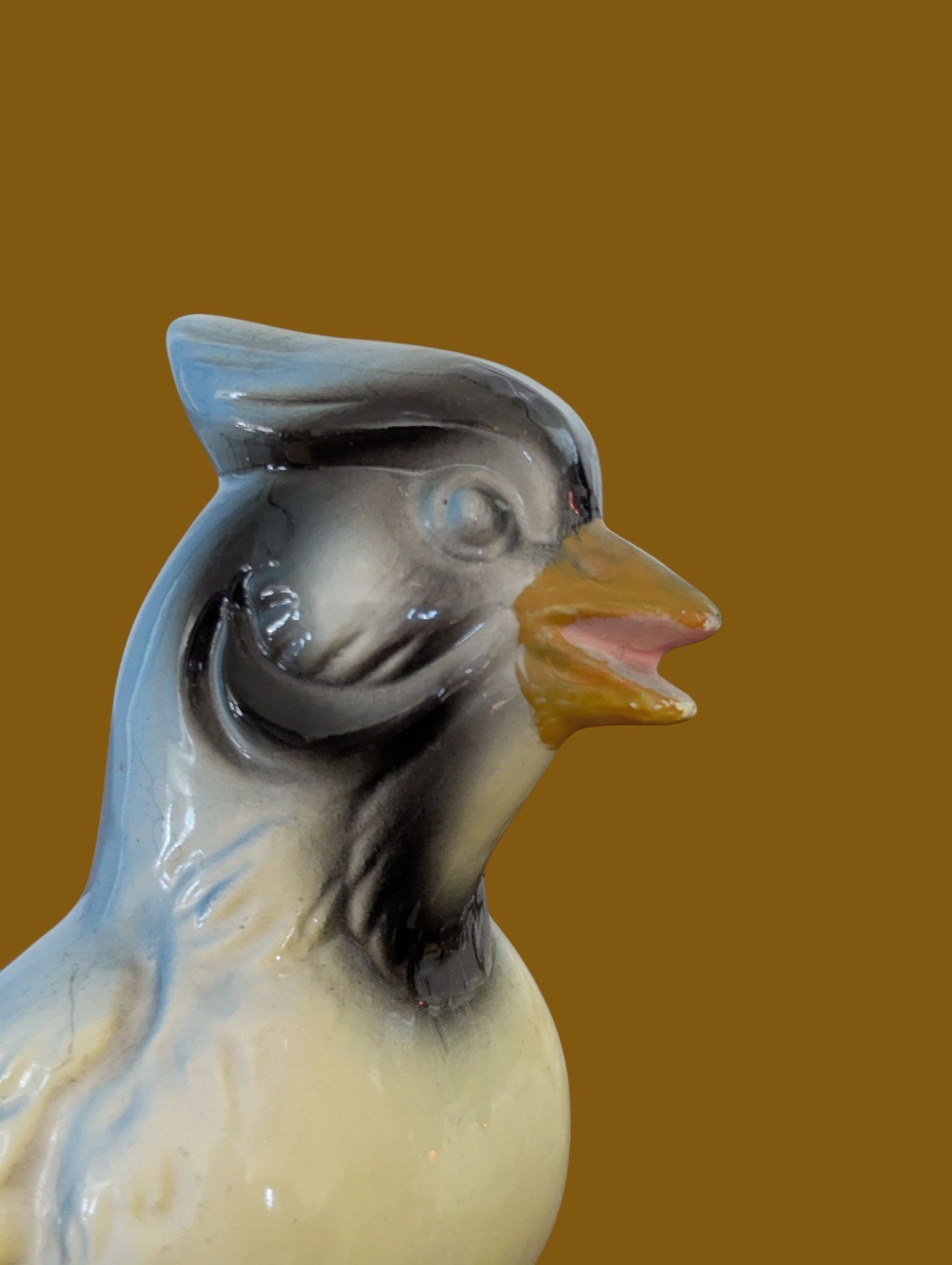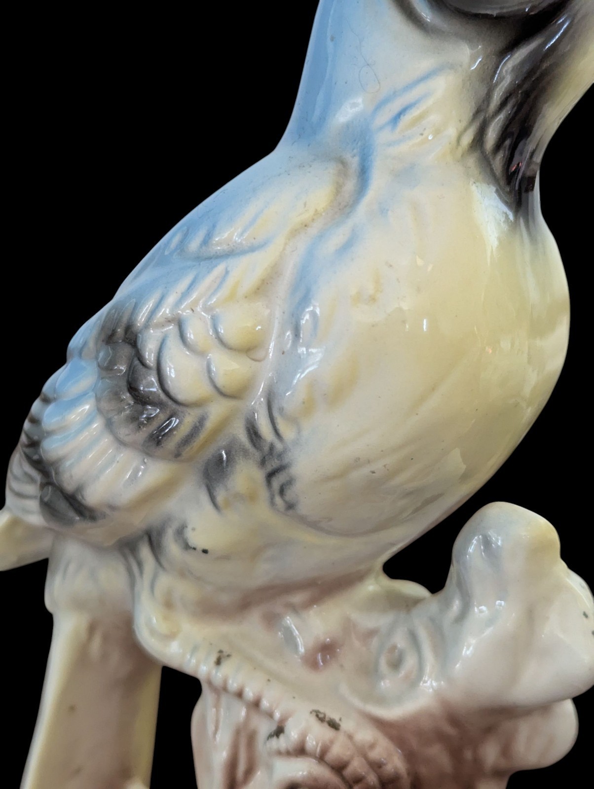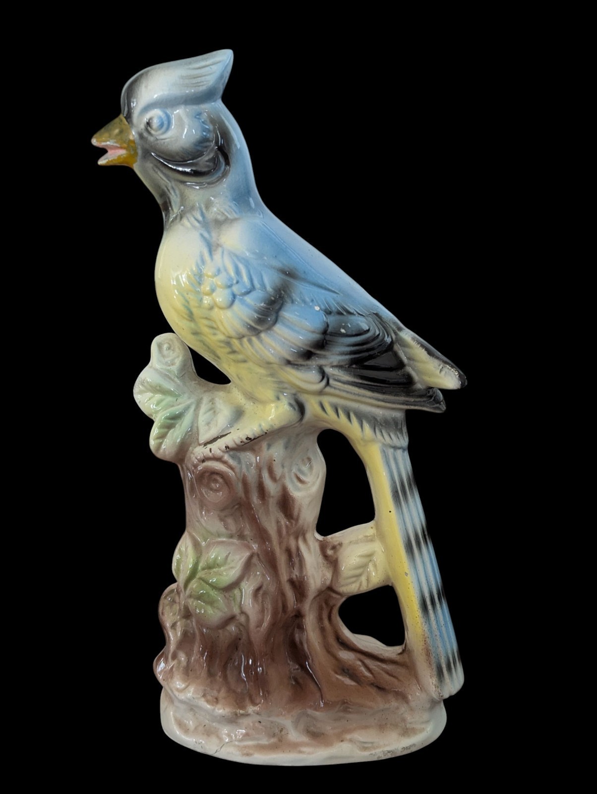 The vintage porcelain Blue Jay bird figurine from Japan stands at 10 inches tall and features intricate details of the bird perched on a stump, surrounded by leaves as it is singing. This collectible piece captures the beauty and charm of the Blue Jay bird in a delicate and elegant form, making it a unique addition to any bird or animal figurine collection. Crafted from porcelain and featuring a hand-painted design, this figurine showcases the artistry and craftsmanship of Japanese artisans. It has 2 small spots on it's left wing(not sure if it's chips) and a tiny crack on the base.