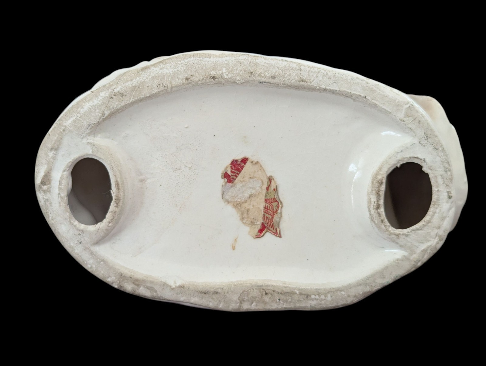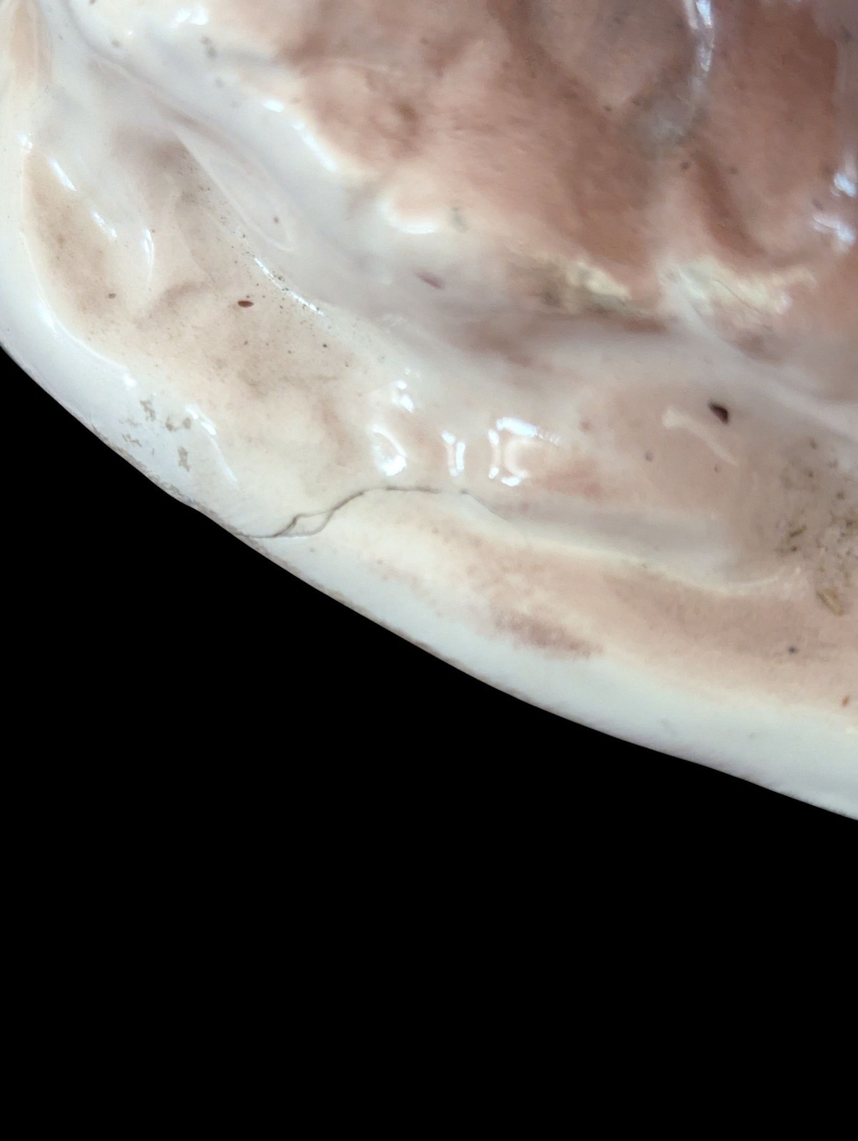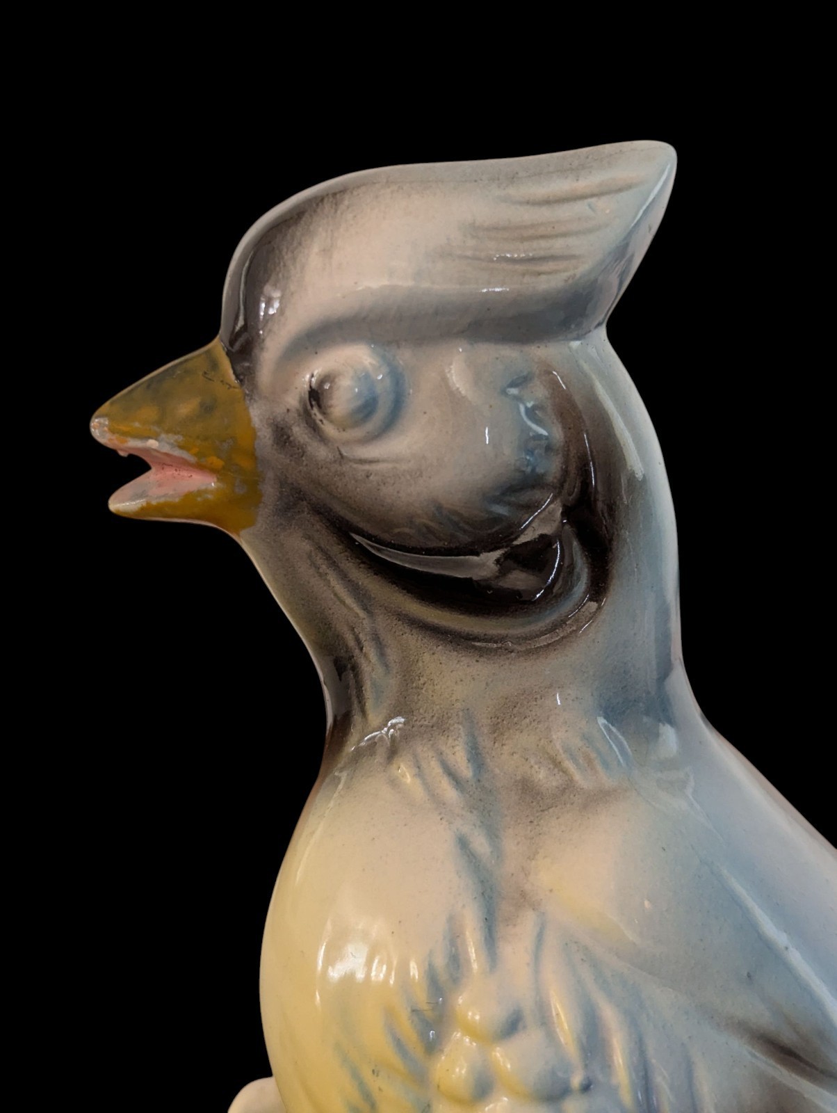The vintage porcelain Blue Jay bird figurine from Japan stands at 10 inches tall and features intricate details of the bird perched on a stump, surrounded by leaves as it is singing. This collectible piece captures the beauty and charm of the Blue Jay bird in a delicate and elegant form, making it a unique addition to any bird or animal figurine collection. Crafted from porcelain and featuring a hand-painted design, this figurine showcases the artistry and craftsmanship of Japanese artisans. It has 2 small spots on it's left wing(not sure if it's chips) and a tiny crack on the base.