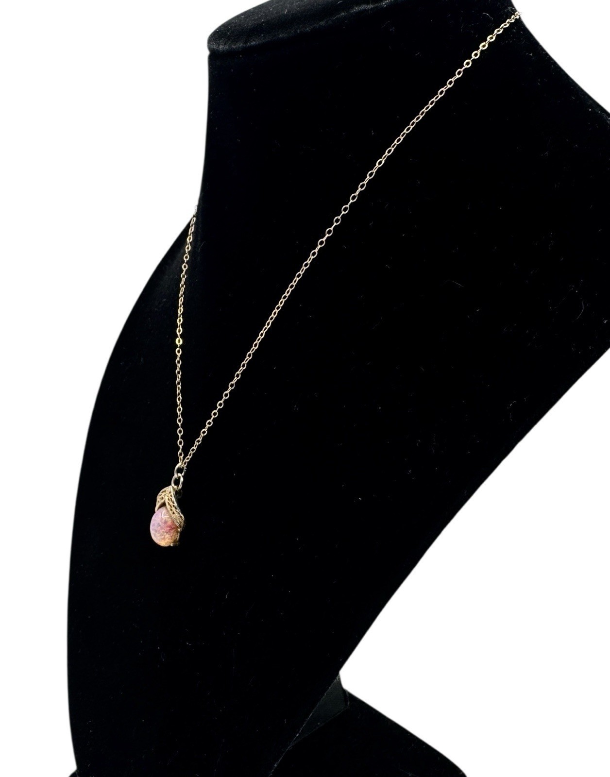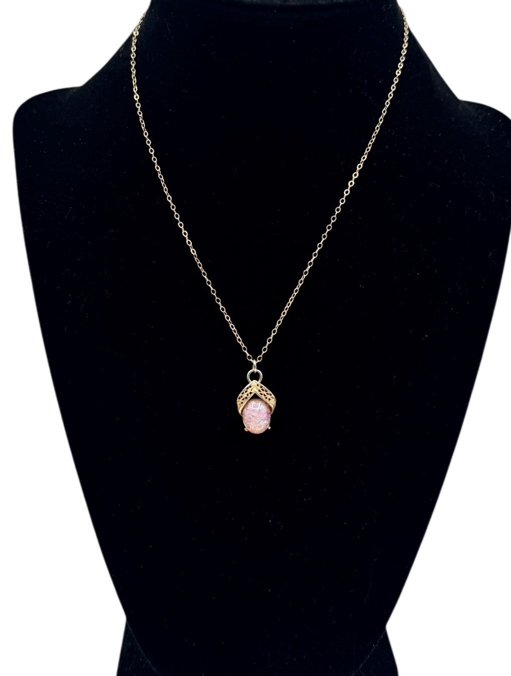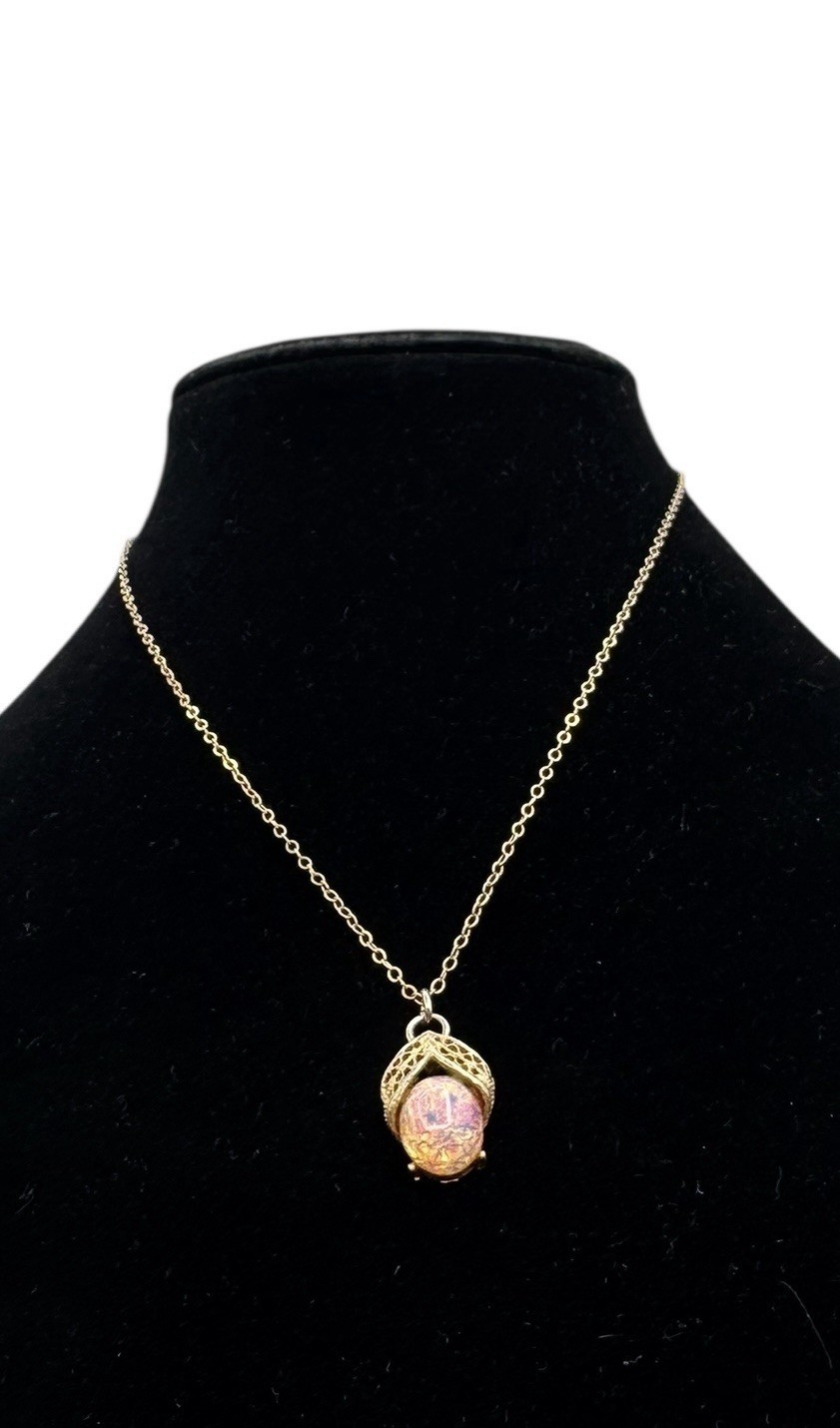 Vintage Foil Opal Pendant Gold Tone Chain Necklace 15" Dainty Filigree Pink