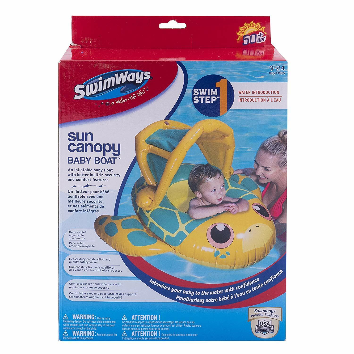 The SwimWays Sun Canopy Baby Boat is an inflatable baby floaty with bright ~ engaging colors and characters that babies love