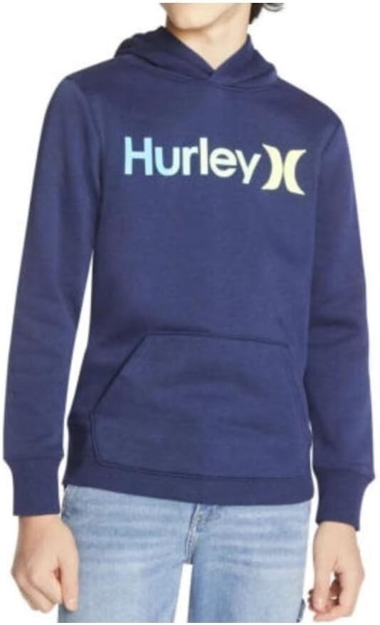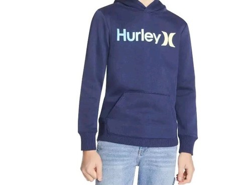 Solid Blue Hoodie ~ Long Sleeve with Ribbed Cuffs ~ Lightweight Fleece Lining ~ HURLEY Graphic Design Across Chest Area ~ Kangaroo Pocket ~ 60% Cotton ~ 40% Polyester