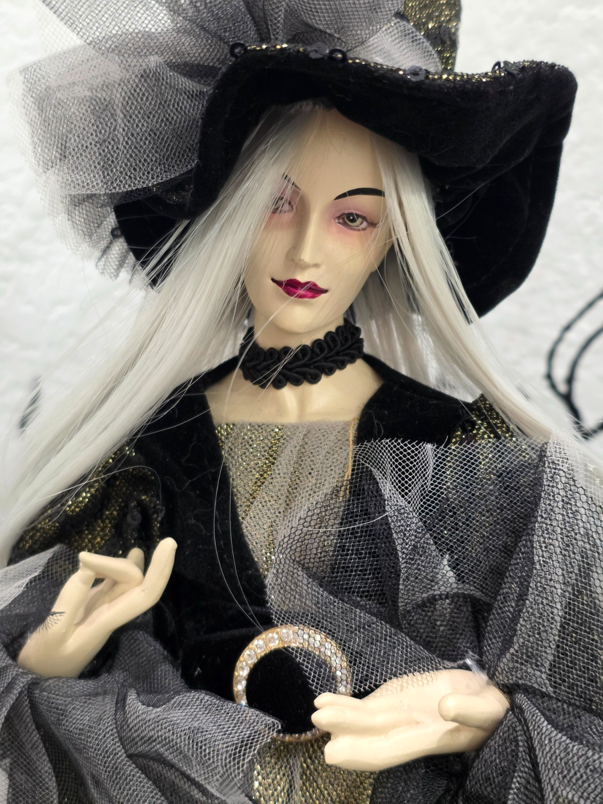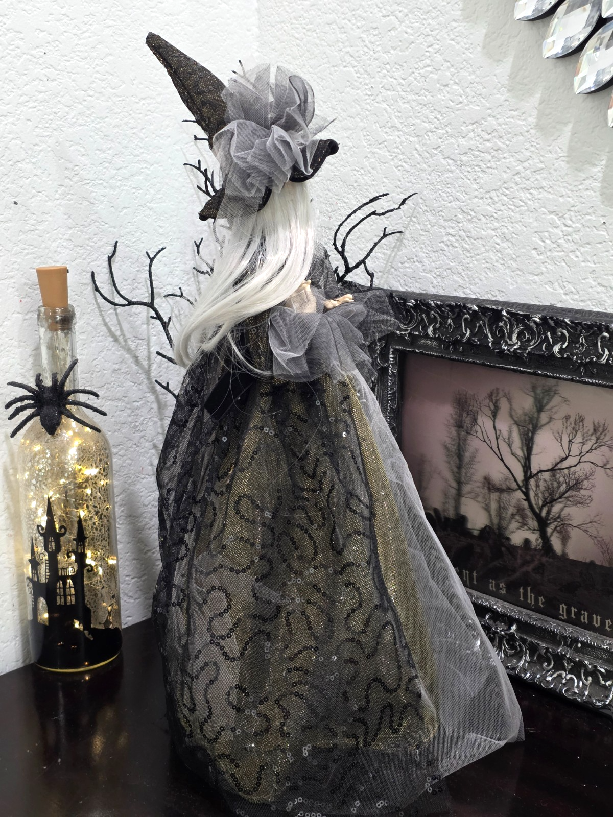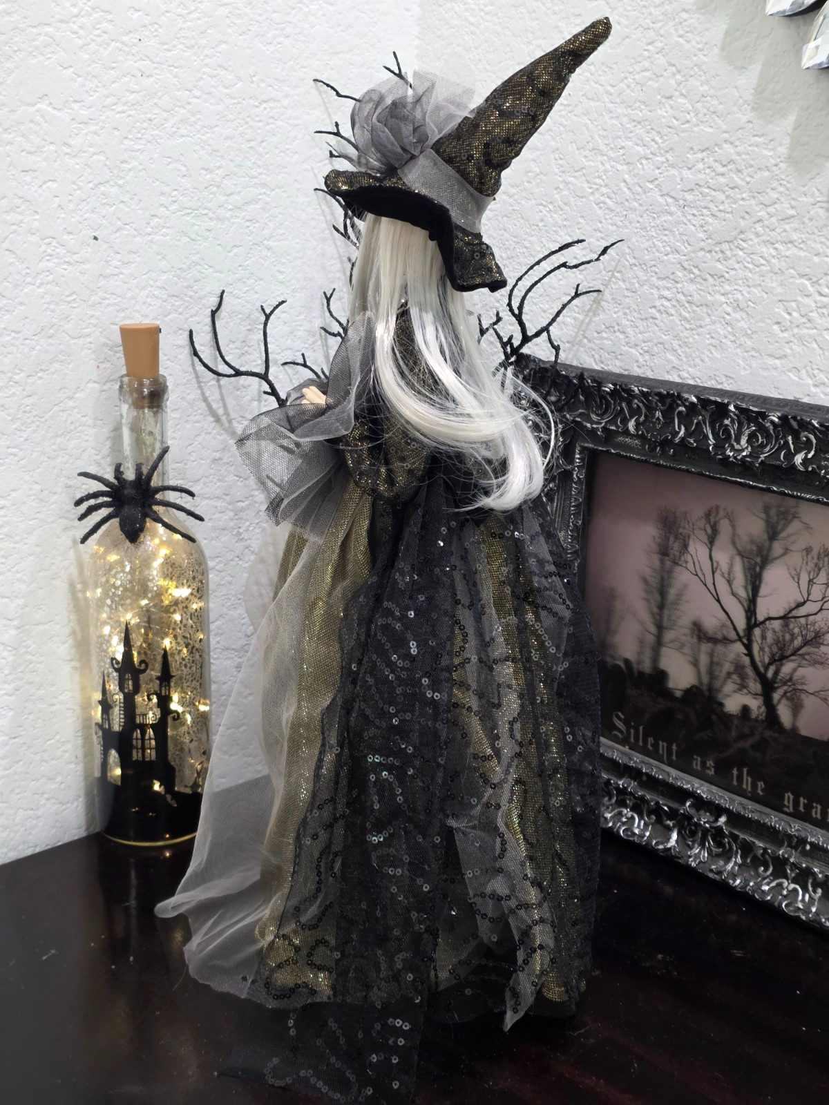LAST ONE!! Up for sale we have this adorable witch for your Halloween decor. Witch is wearing a black and gold sequins dress and her hair is white/gray. She is beautiful!! She stands on a metal base (see last picture) and stands approx 17" tall. Made of resin. NEW