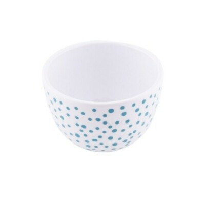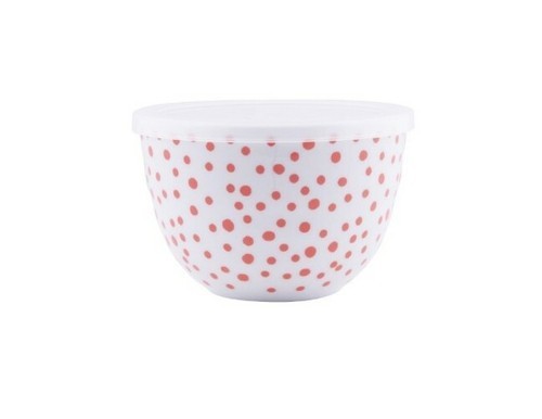 Polka dot pattern throughout on each bowl in different colors with a solid white interior
