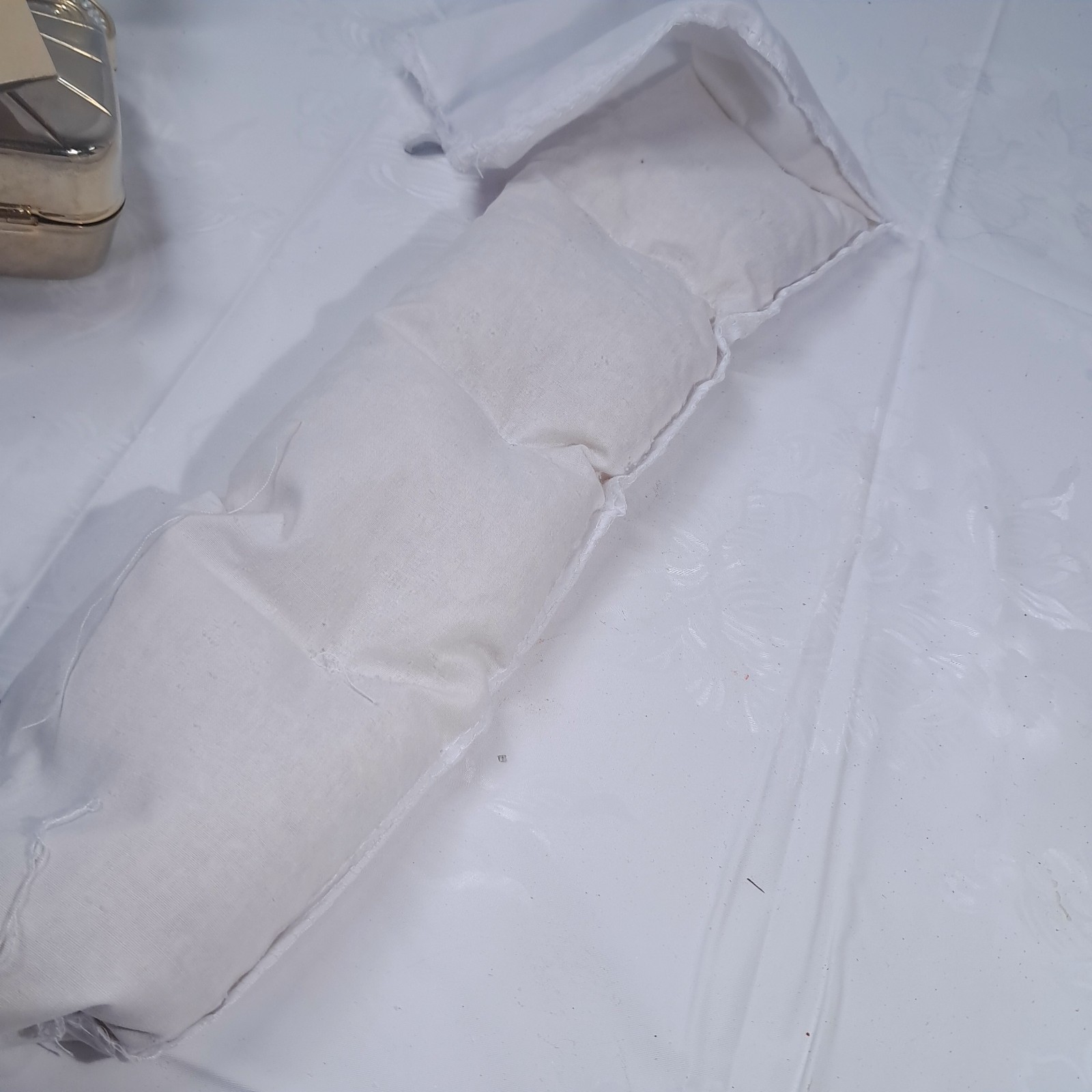 Green removable cover. Inside warming pack is about half full and some is coming loose from the fabric, as shown. Green microfiber cover is in very good condition. See pics