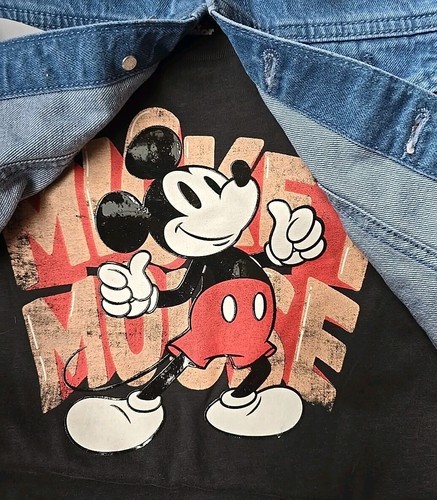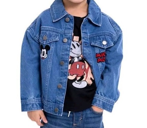 Denim Jacket ~ Button Closure ~ Faux Pockets ~ Mickey Mouse Face Stitched on Right Side Pocket and the Words MICKEY MOUSE Stitched on Left Side Pocket ~ 100% Cotton