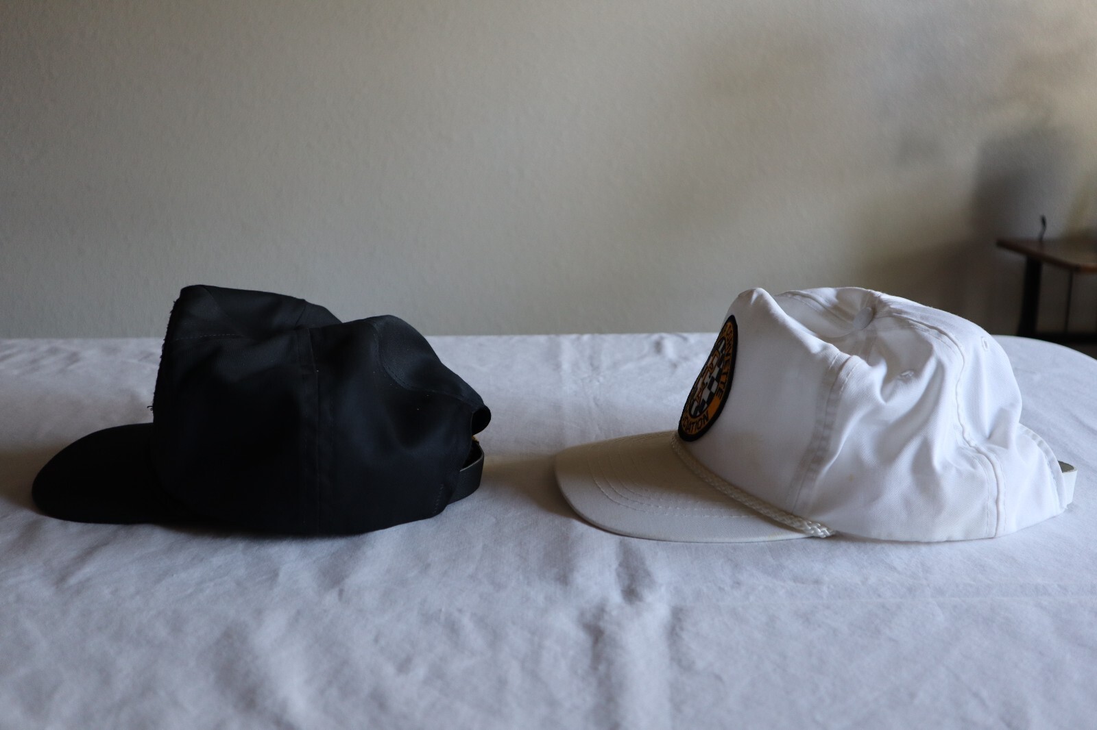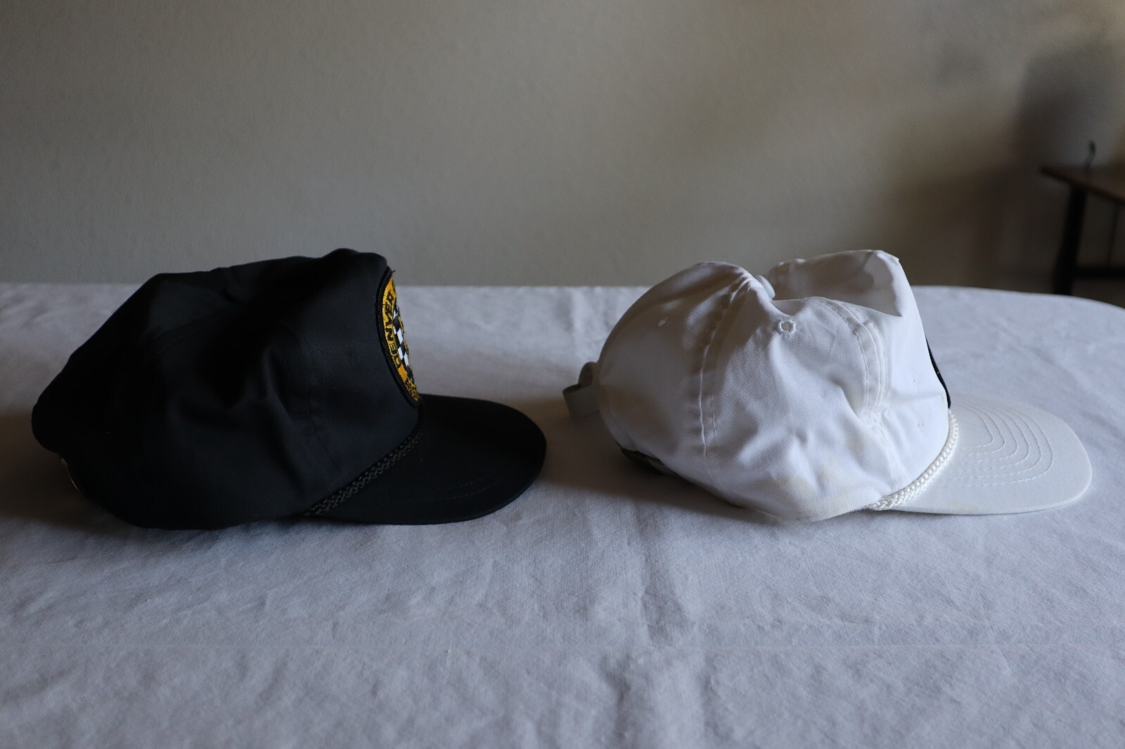 The black hat has no tags but is made identical to the white hat.