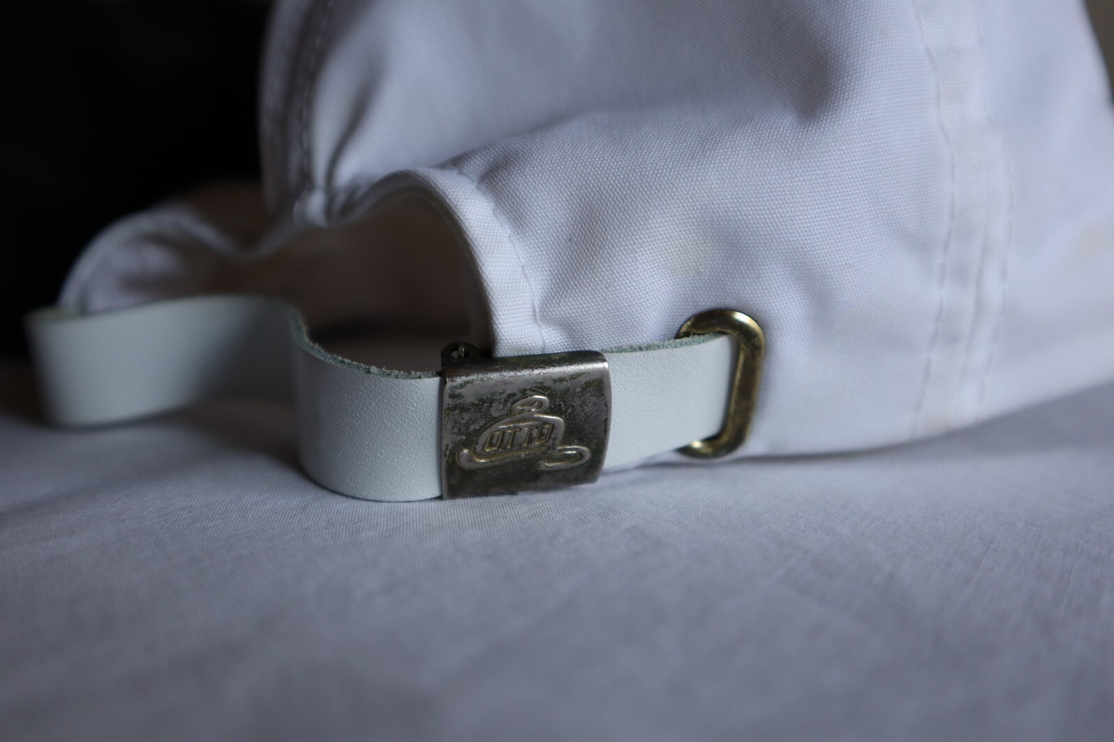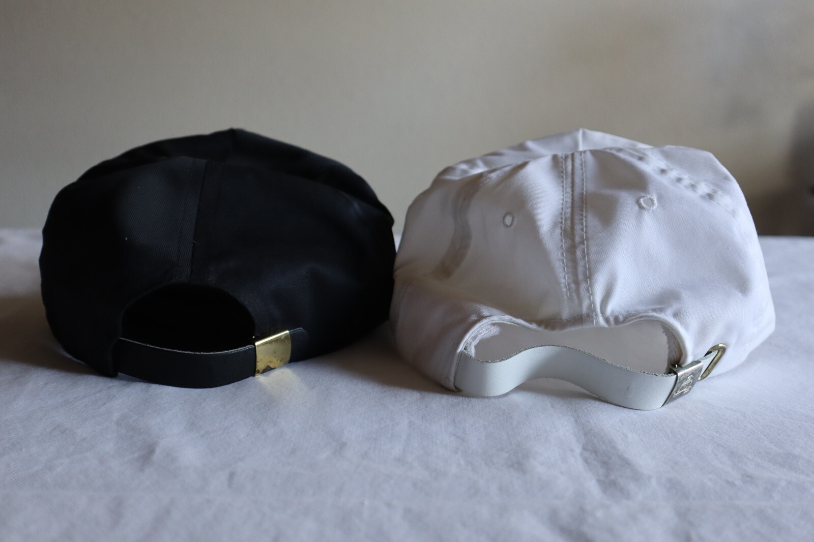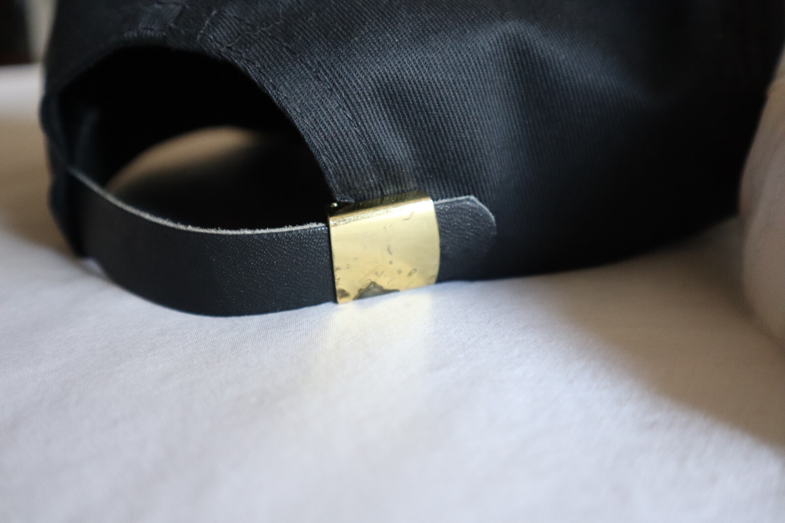 The black hat has some tarnish on the metal in the back.