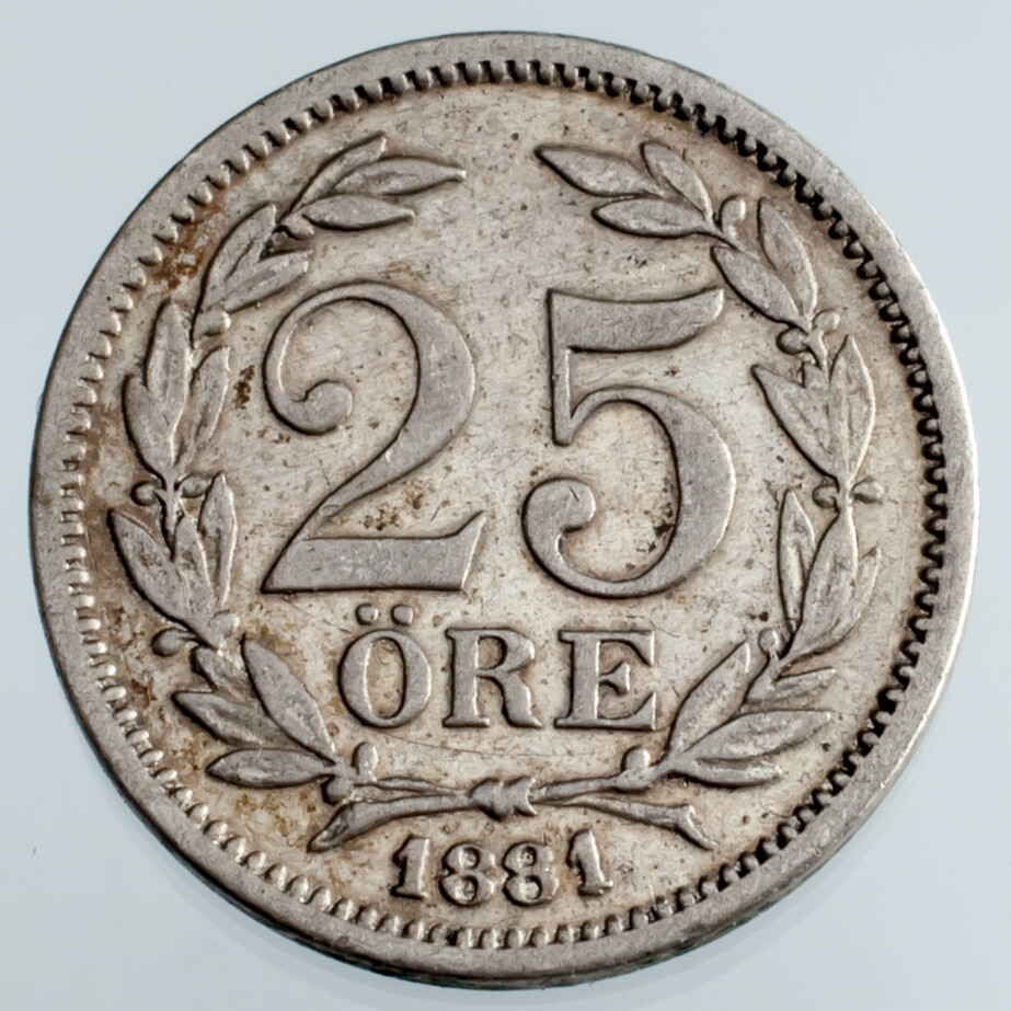 1881-EB Sweden 25 Ore Silver Coin in XF Condition KM #739