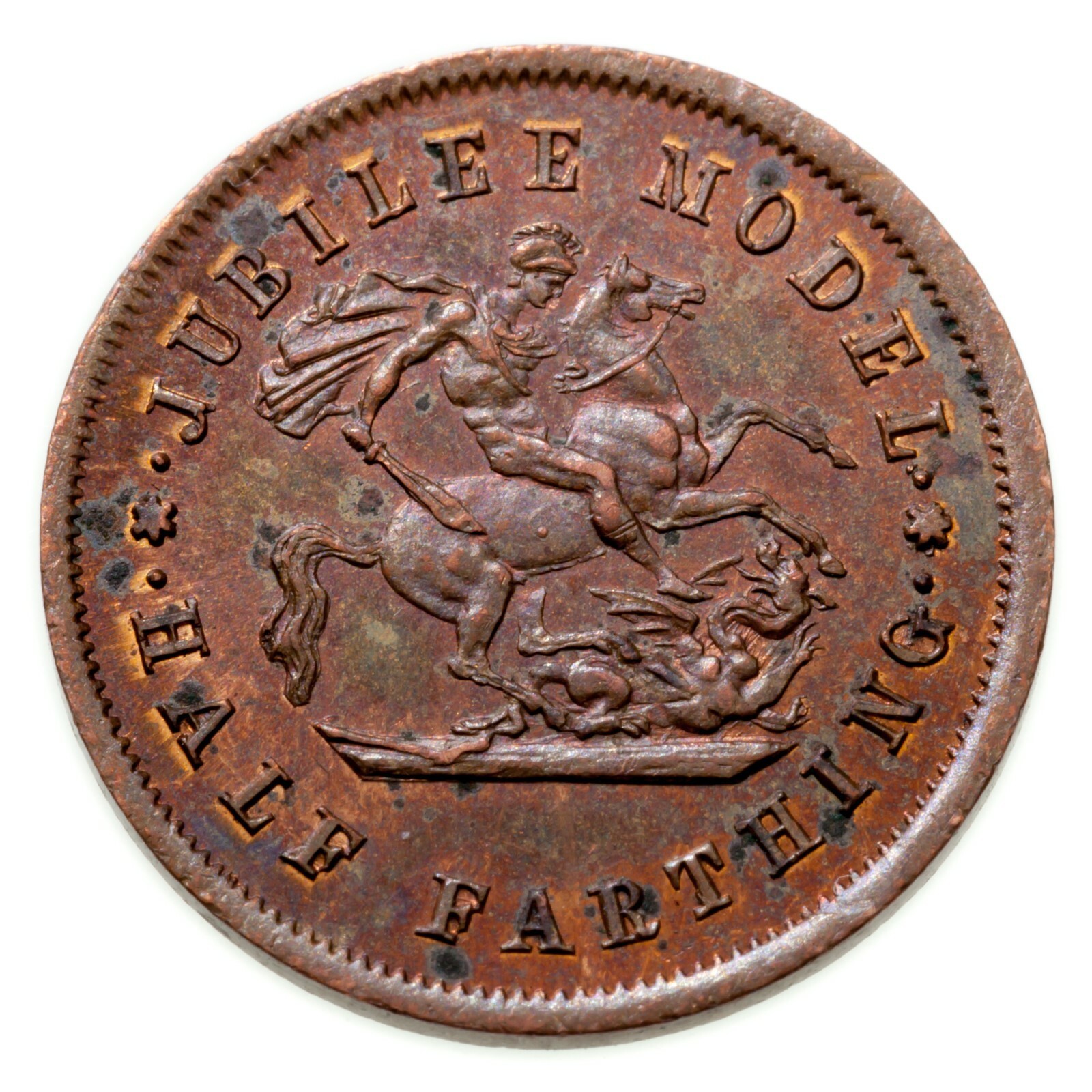 Reverse: St. George stomping Dragon "JULILEE MODEL" "HALF FARTHING"