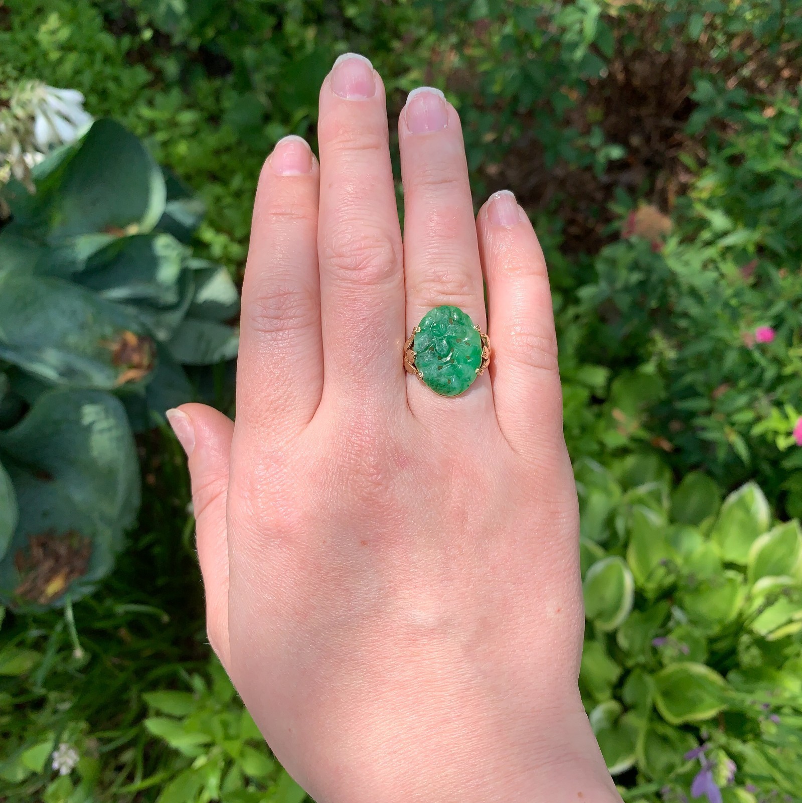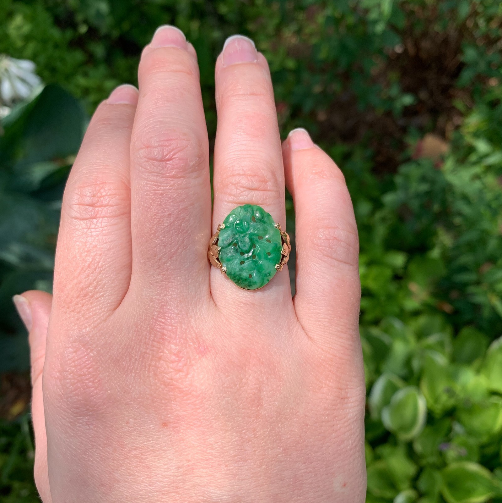 14k yellow gold ring with carved green jade. The ring has a GIA report #2231536663 stating natural A jadeite jade, no indication of dye. The jade measures about 20mm x 15mm and has bright green color. The jade has carved flowers and there are three applied gold leaves on either side. It is stamped Ming's 14K.