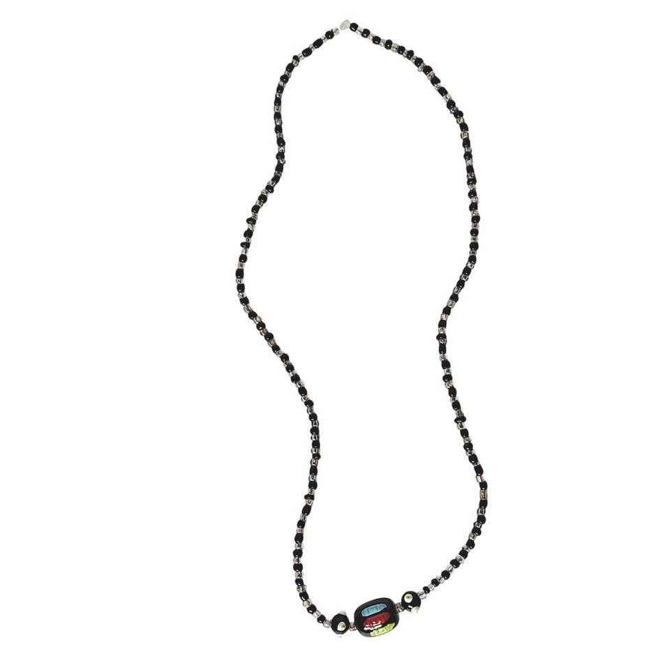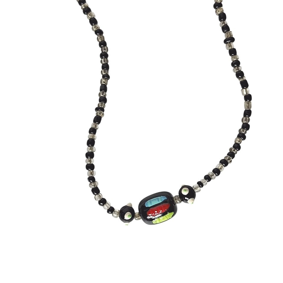 Handcrafted Black & Silver Beaded Necklace With Multicolor Focal Bead Jewelry