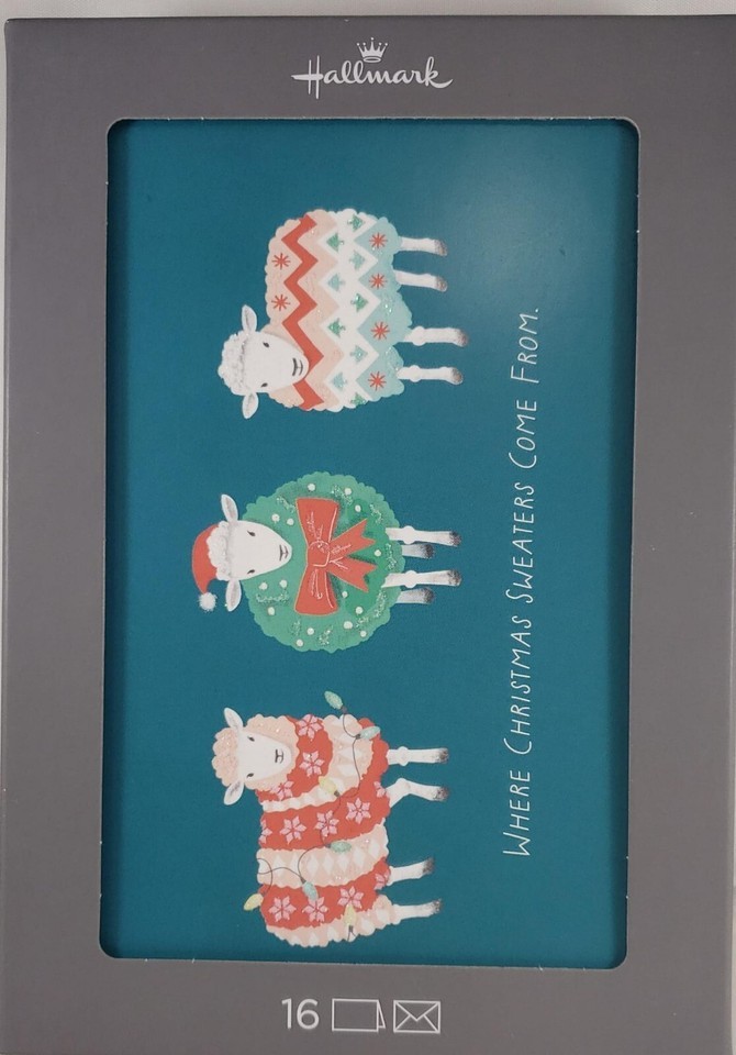 Boxed Christmas cards pack features cute illustrations of holiday sheep in wooly holiday sweater designs on a dark teal background. These holiday cards are perfect for sending a little laugh and season's greetings to friends, family and loved ones. Glitter accents. Includes 16 cards and envelopes.