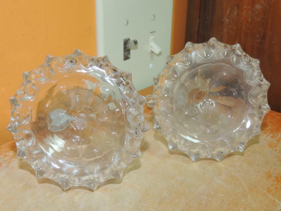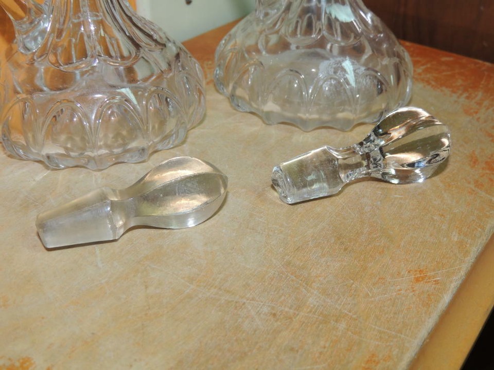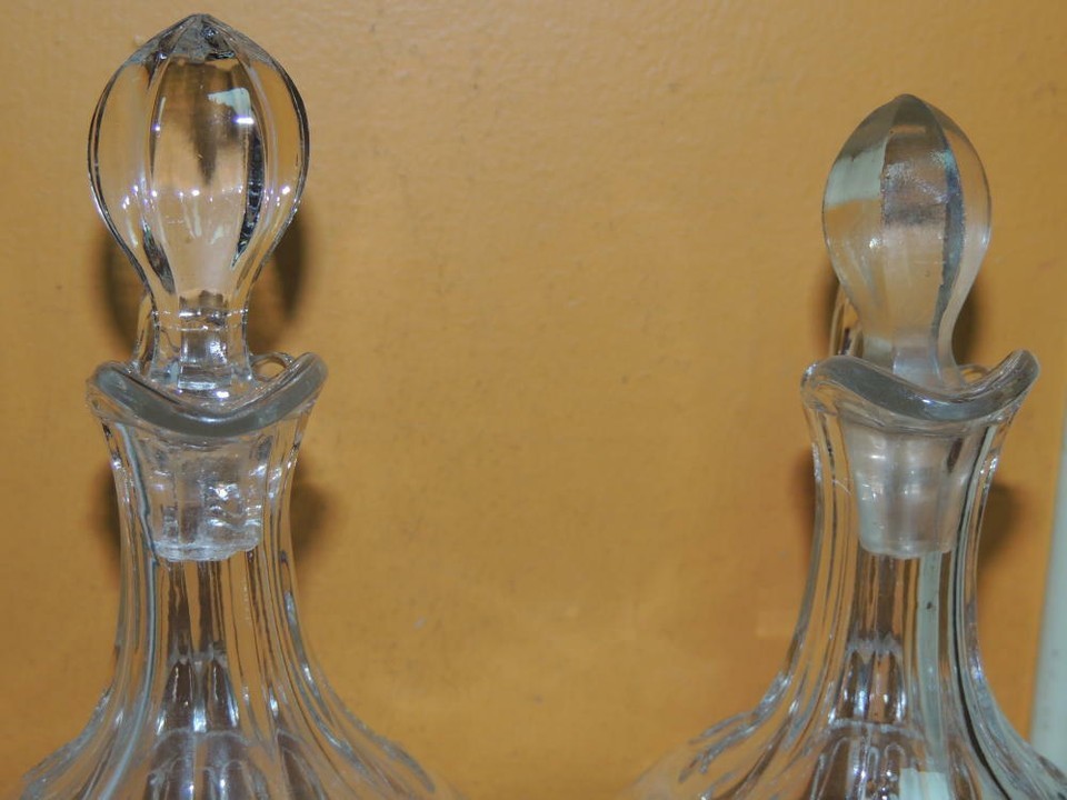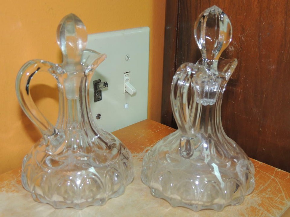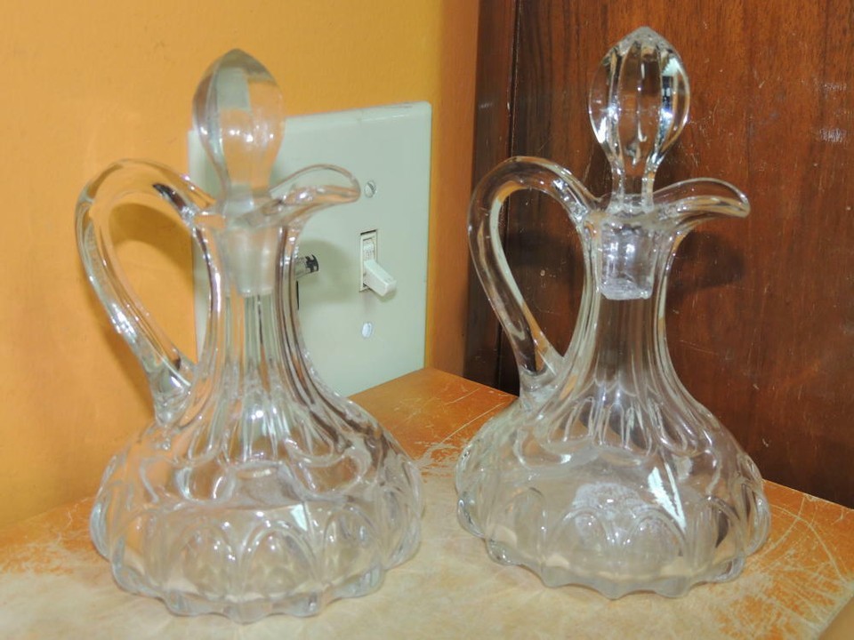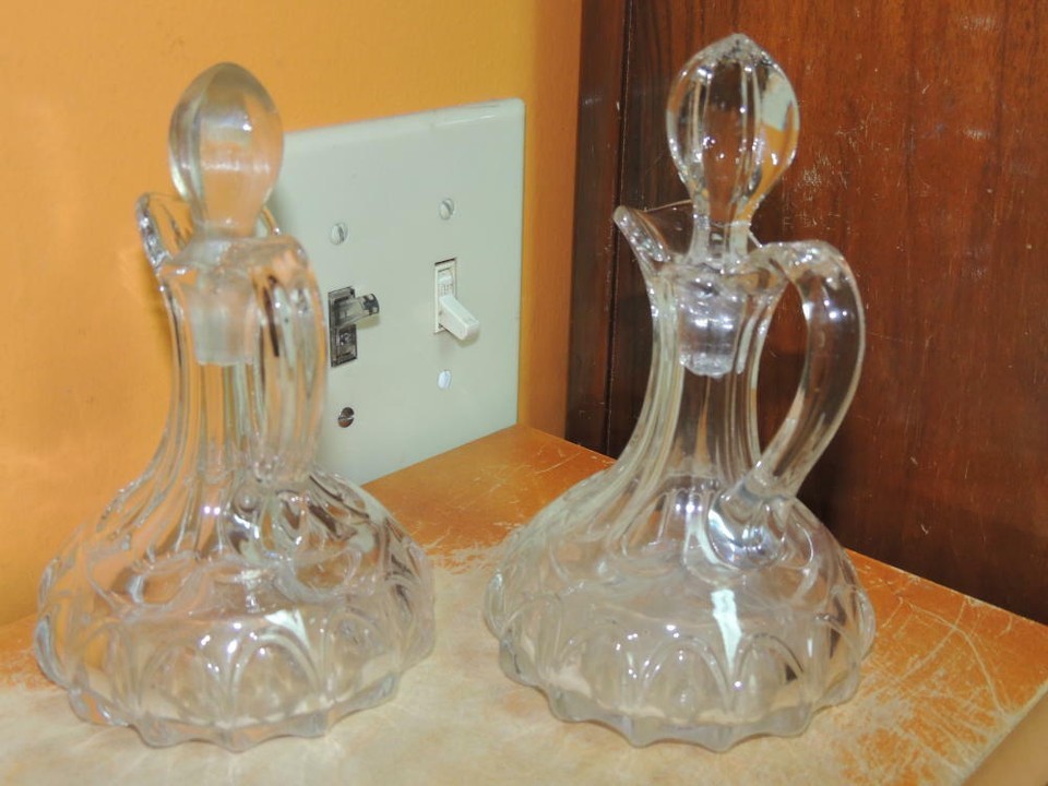 TWO GLASS CRUET - BEING HAND MADE THEY ARE NOT IDENTICALLY SIZED. PLEASE EXAMINE PHOTOS CLOSELY