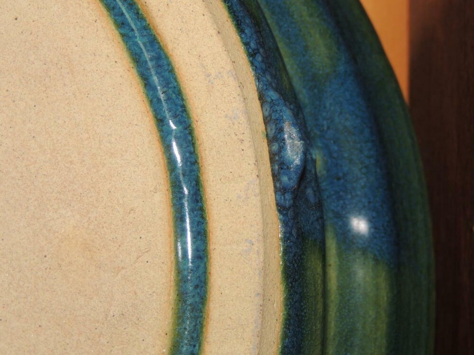 Art Pottery Bowl 13"x2.25" green blue bubble drip glaze Vintage style stoneware