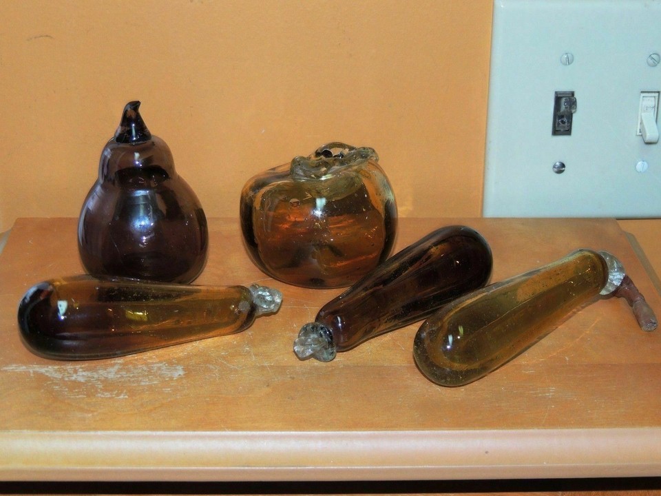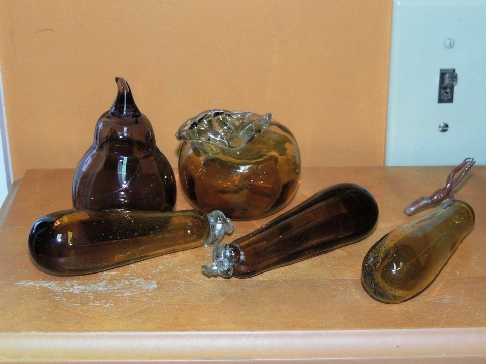 ART GLASS VEGETABLES. THEY ARE MOSTLY AMBER WITH SOME PURPLE. PLEASE LOOK AT THE PICTURES CAREFULLY.