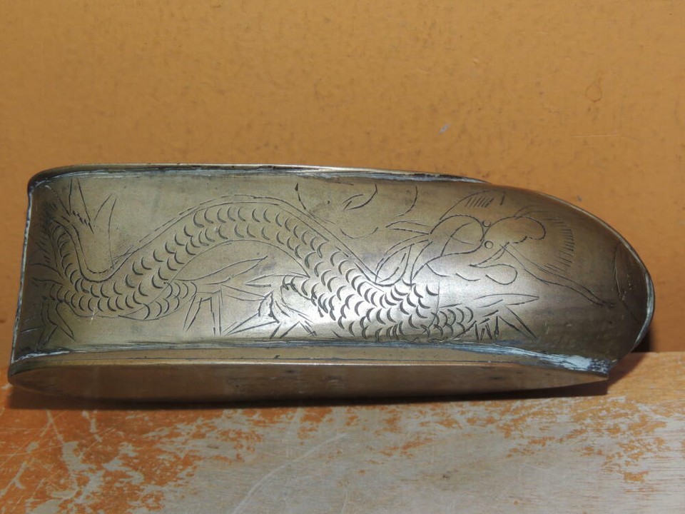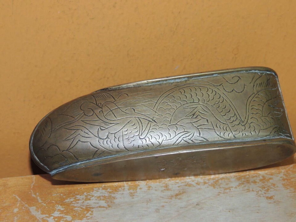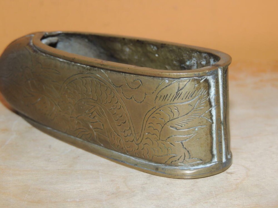 Chinese Bronze / Brass Shoe 4"+ etched dragon pearl unmarked poss 19th Antique