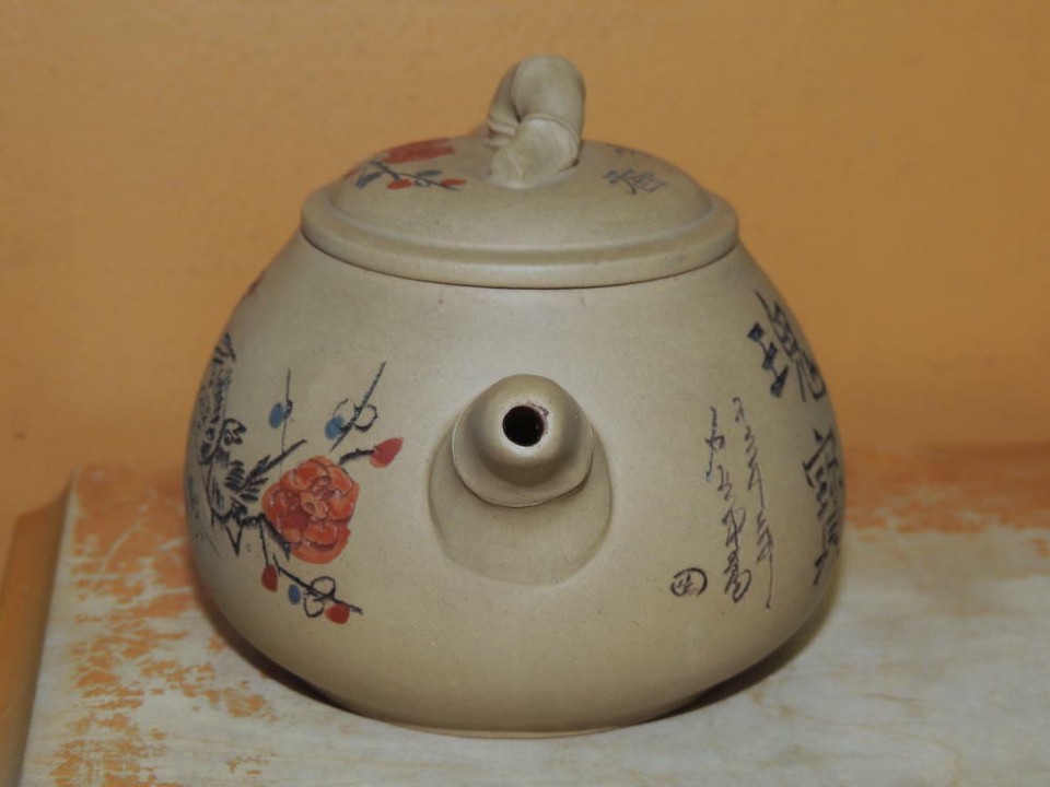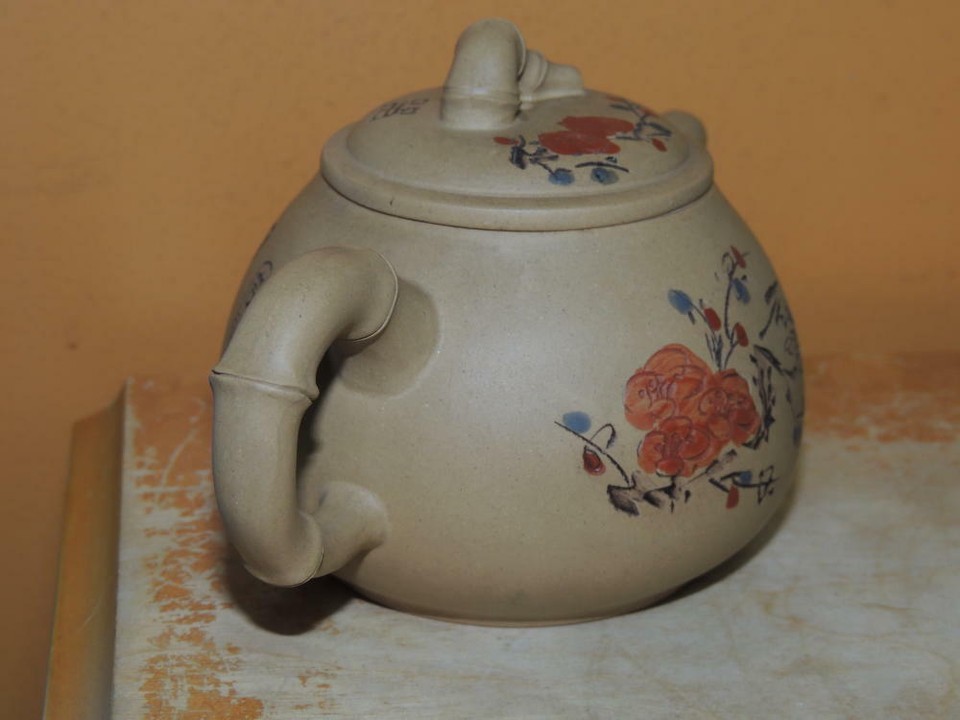Vintage Chinese 3.75" Yixing Zisha Teapot Yellow birds flowers Vintage marked