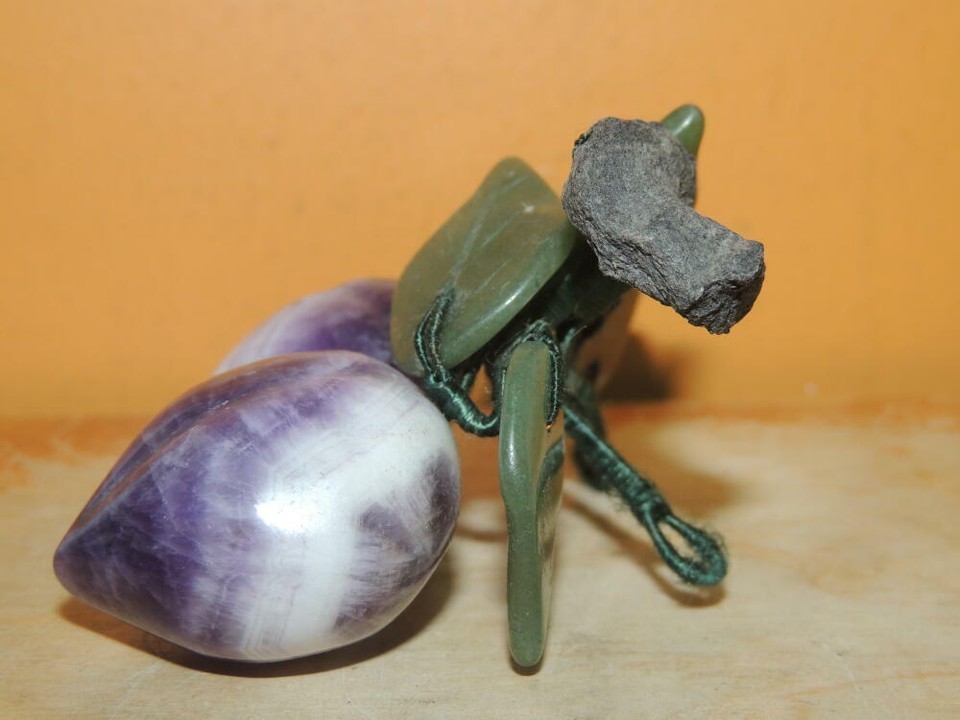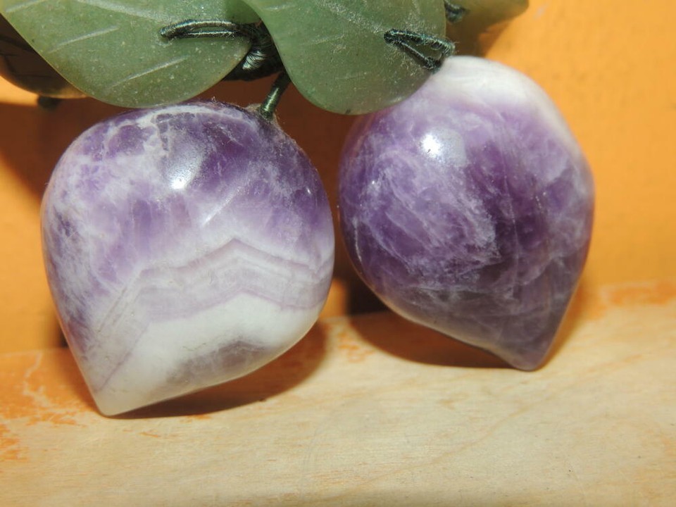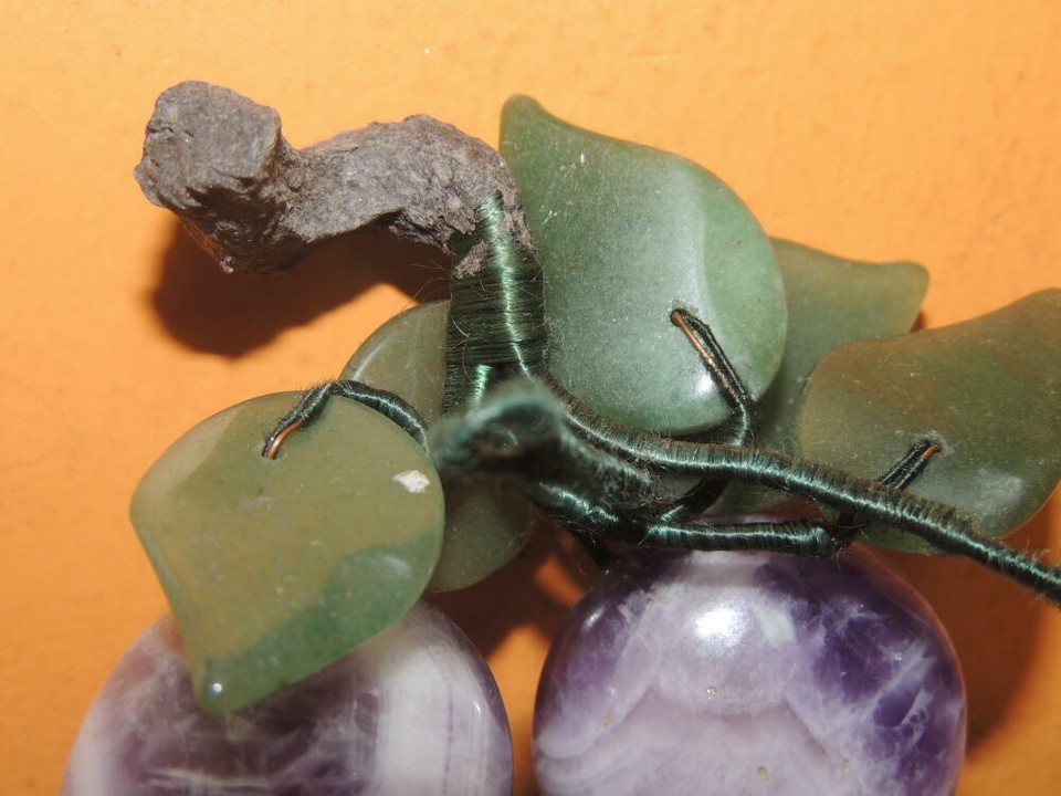 QUARTZ PEACH ON THE BRANCH, THE BRANCH IS DEFINITELY MAN MADE, BUT IT IS AN EXCELLENT REPLICA OF PETRIFIED WOOD. I AM NOT AN EXPERT BUT MY RESEARCH INDICATES THIS IS POSSIBLY CHEVRON AMETHYST WITH GENUINE JADE. PLEASE LOOK AT THE PICTURES CAREFULLY.