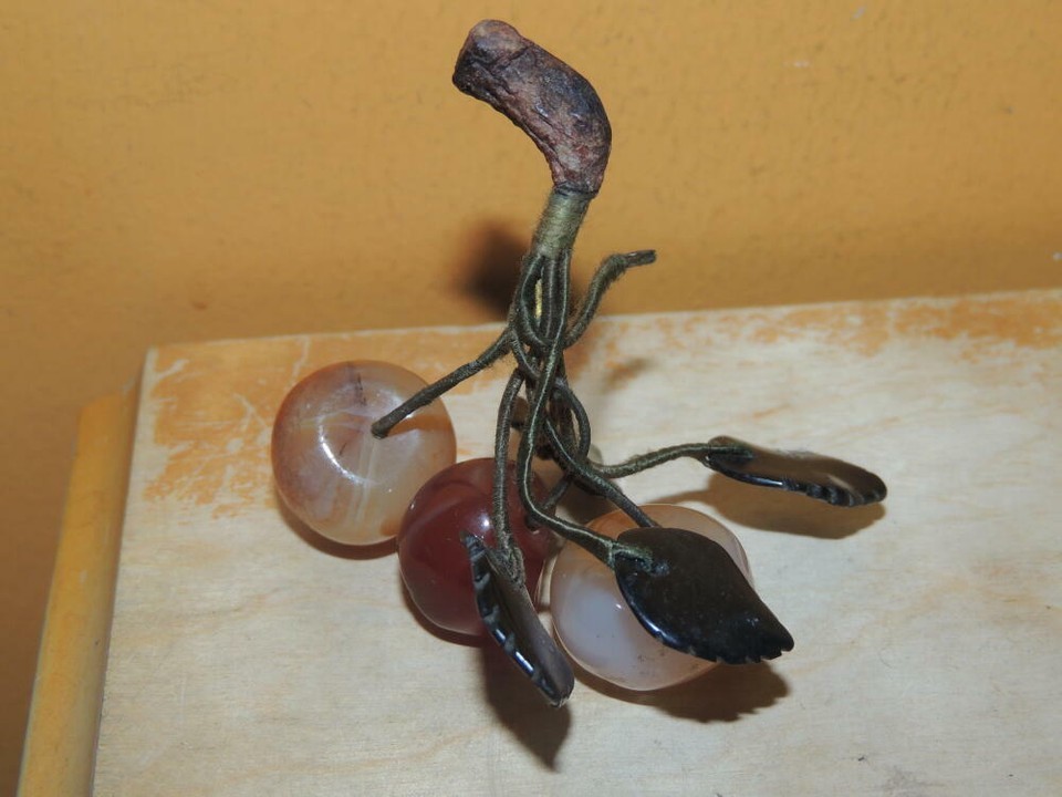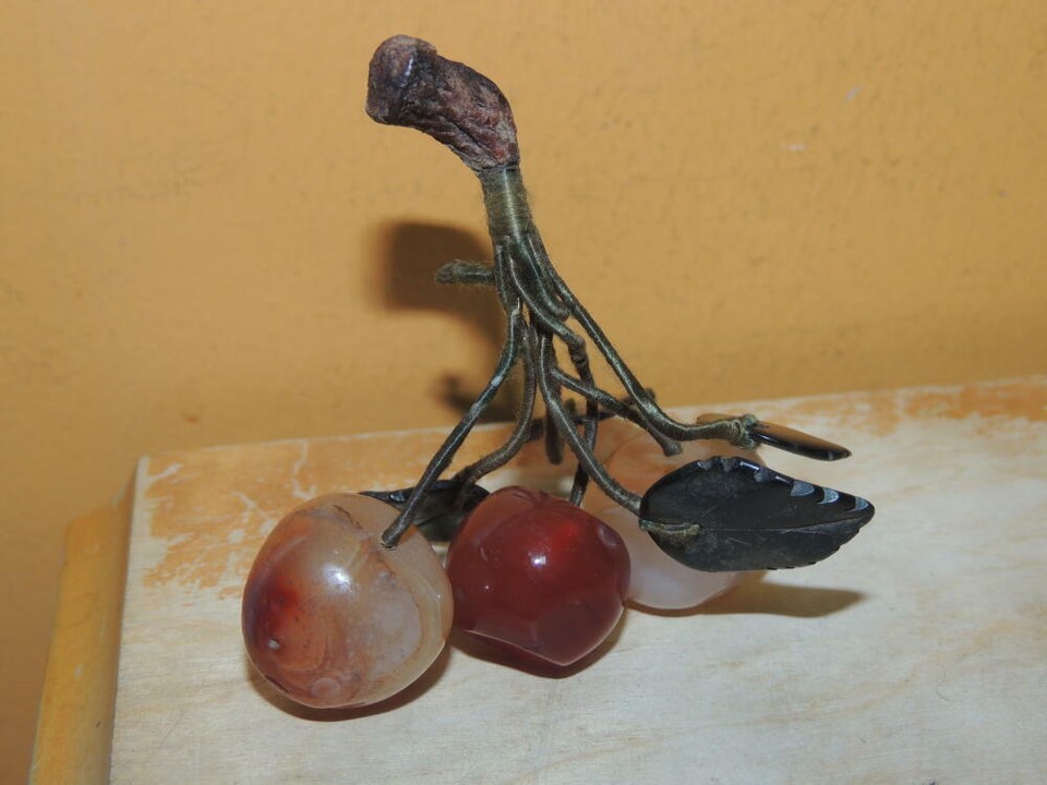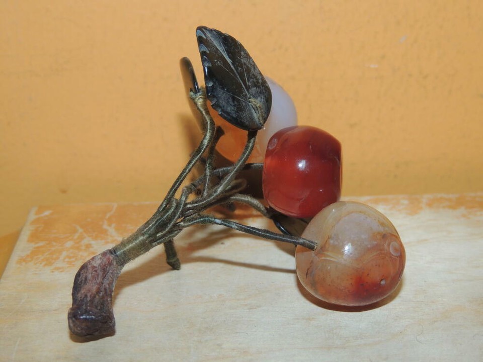 AGATE CHERRIES ON THE BRANCH, THE BRANCH IS DEFINITELY MAN MADE, BUT IT IS AN EXCELLENT REPLICA OF PETRIFIED WOOD. I AM NOT AN EXPERT BUT RESEARCH INDICATES THIS IS POSSIBLY CARNELIAN WITH GENUINE JADE LEAVES. PLEASE LOOK AT THE PICTURES CAREFULLY.