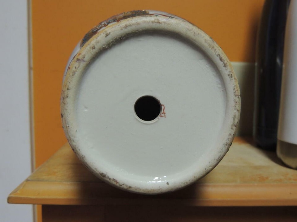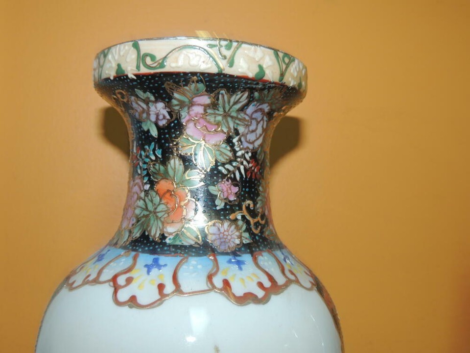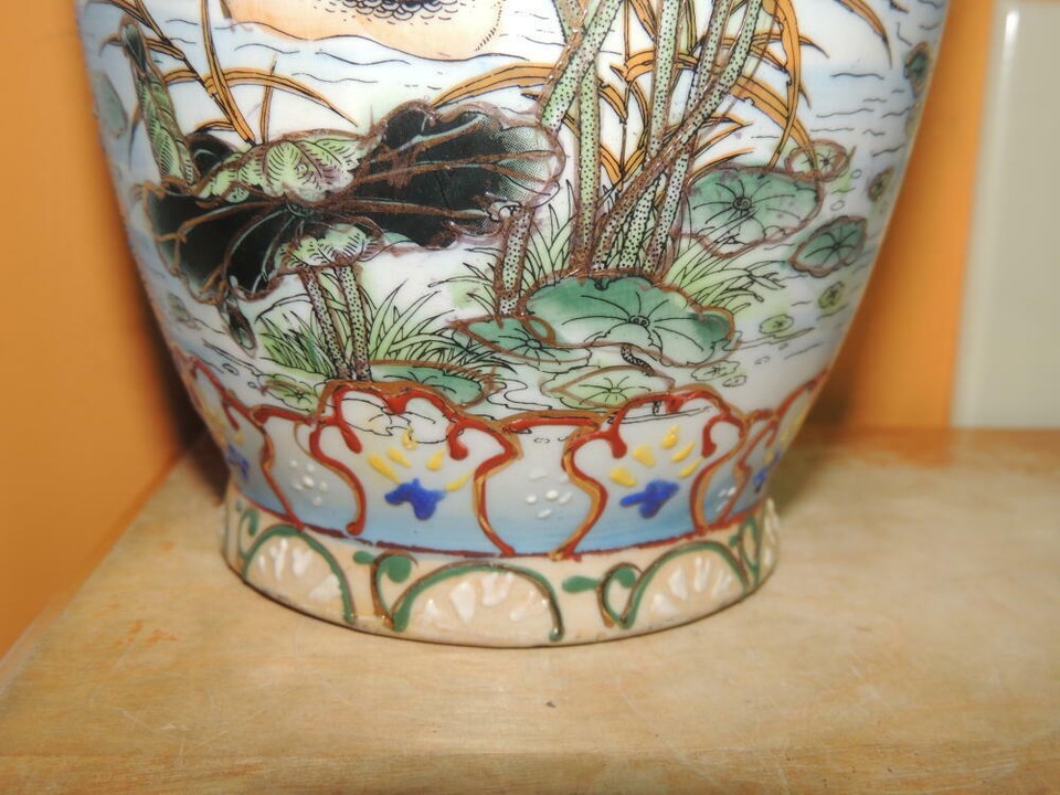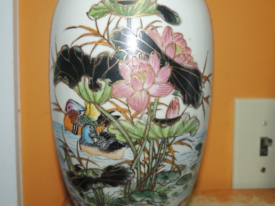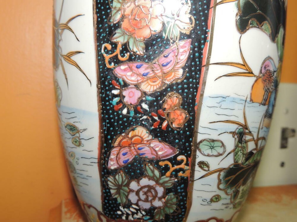Hand Painted Vase 11.75" duck lily butterfly gold moriage Vintage lamp drilled