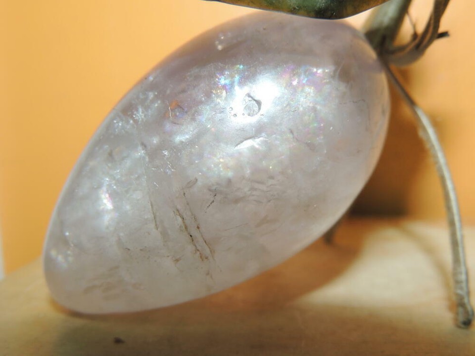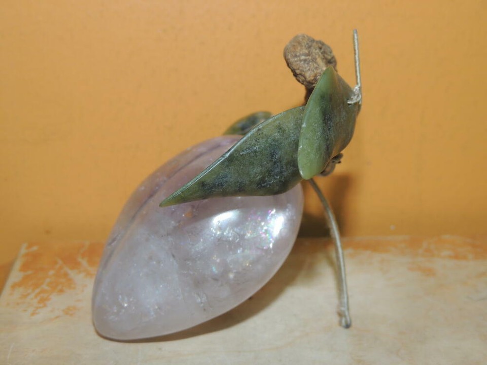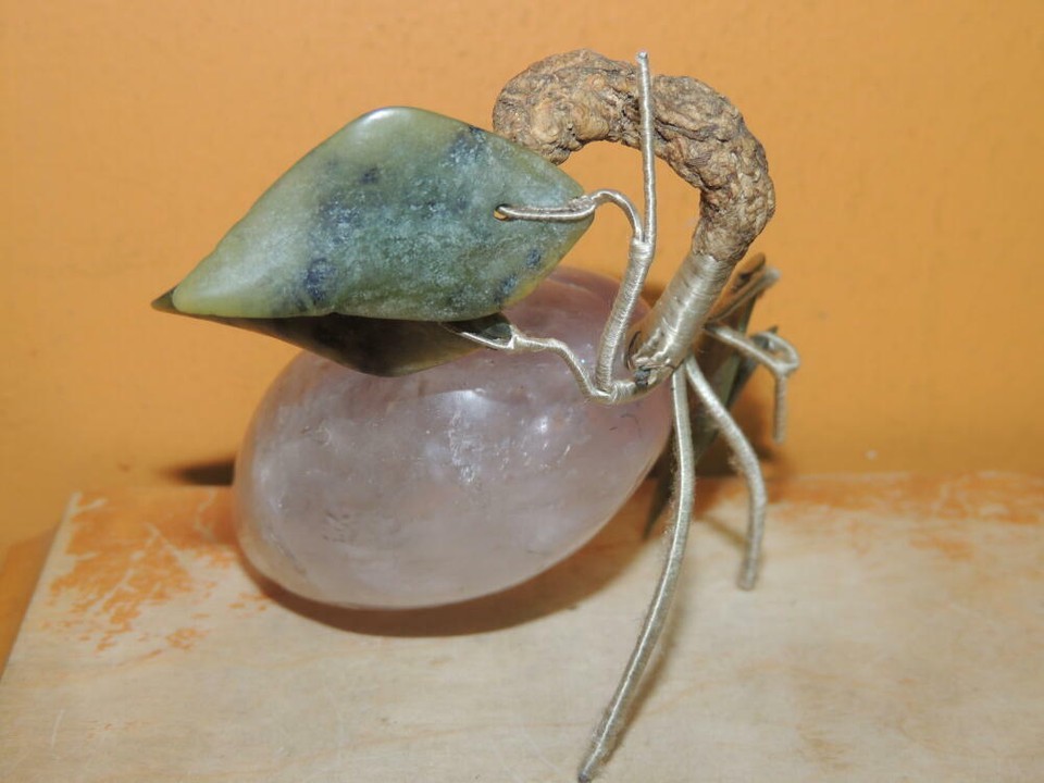 QUARTZ PEACH ON THE BRANCH, THE BRANCH IS DEFINITELY MAN MADE, BUT IT IS AN EXCELLENT REPLICA OF PETRIFIED WOOD. I AM NOT AN EXPERT BUT MY RESEARCH INDICATES THIS IS POSSIBLY ROSE DE FRANCE AMETHYST WITH GENUINE JADE. PLEASE LOOK AT THE PICTURES CAREFULLY.