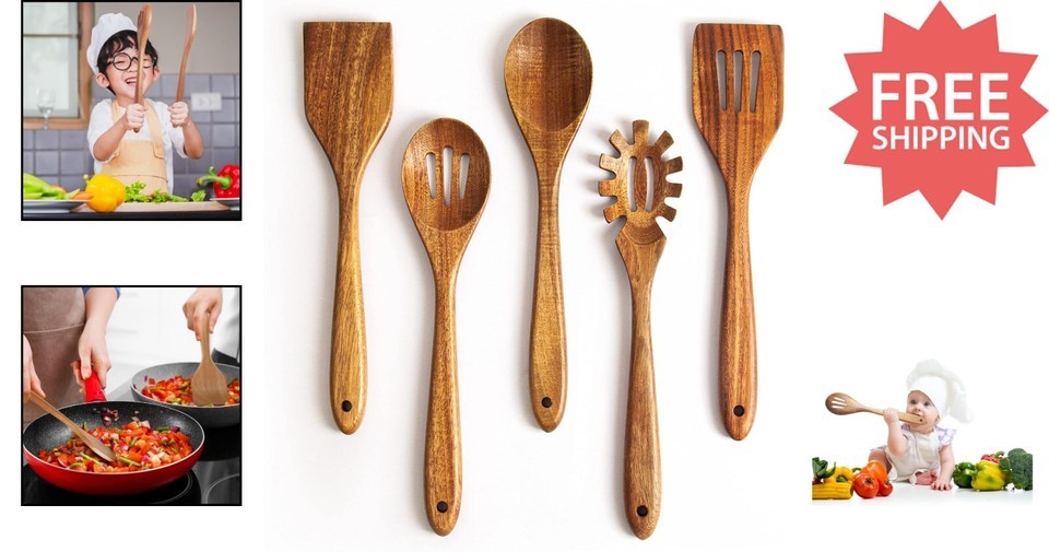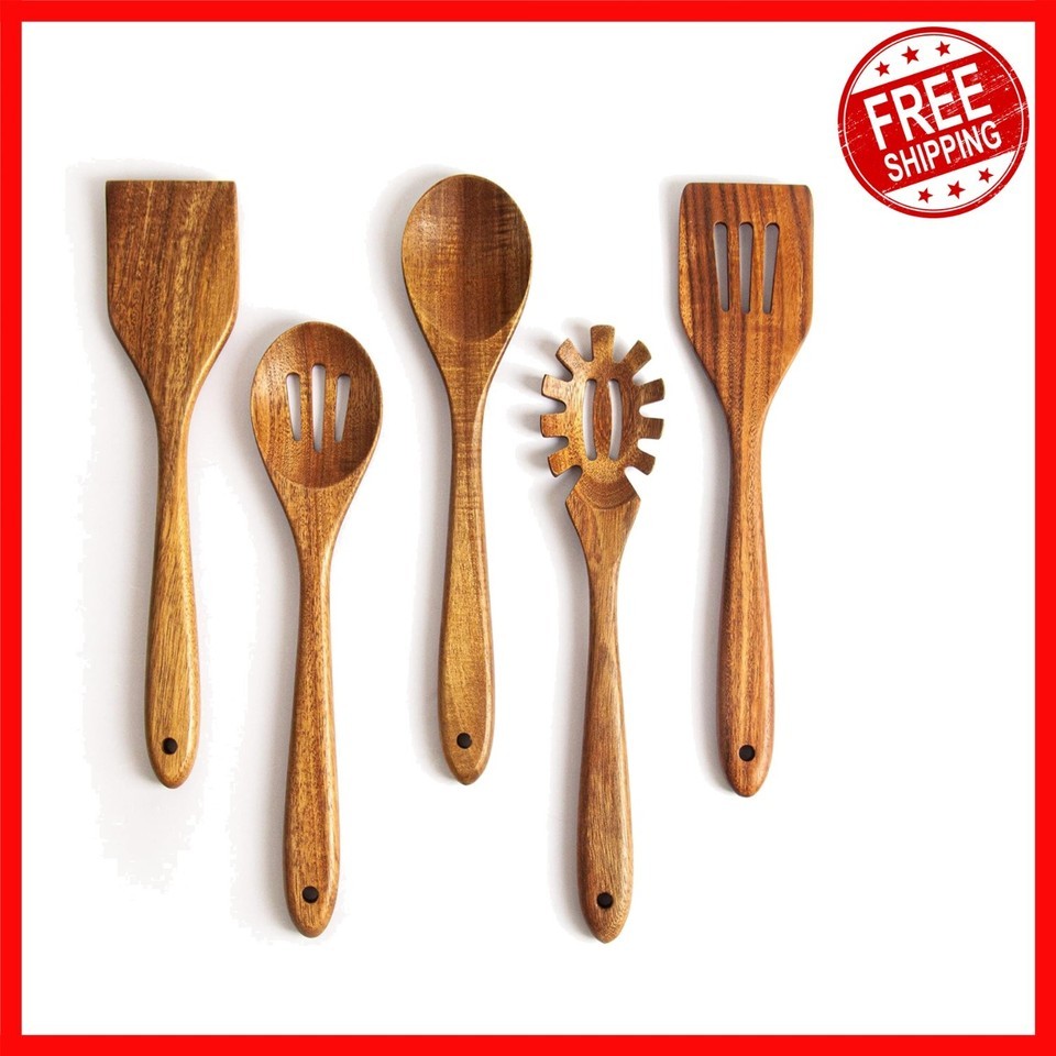 Handcrafted Acacia Wooden Spoon Set: 5 Essential Utensils for Cooking and Baking