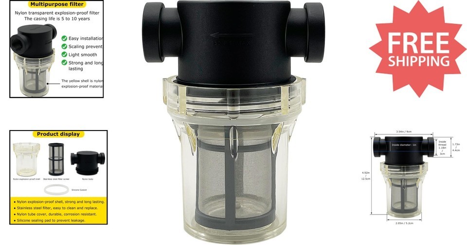 Upgrade your filtration system with our durable 100 mesh stainless steel filter screens, designed for efficient mass flow. Features include a simple twist-off bowl for easy cleaning, a transparent nylon top with a clear bowl to monitor your filter status, and multiple inlet options ? water float valves for up-inlet and side-inlet configurations. The compact dimensions of 3.54" L x 4.72" W x 2.05" H make it suitable for various setups. The in-line female NPT strainer ensures optimal performance. Whether you need multiple units or single, our product offers reliable function combined with user-friendly design. To ensure fast and reliable delivery, we work with multiple fulfillment partners and suppliers. Depending on availability and location, your order may ship from different warehouses or arrive in packaging that varies from item to item. Tracking details are typically provided shortly after shipment, and customer satisfaction remains our top priority. Please note that due to carrier policies and regional regulations, certain items may not be eligible for delivery to specific states or territories.