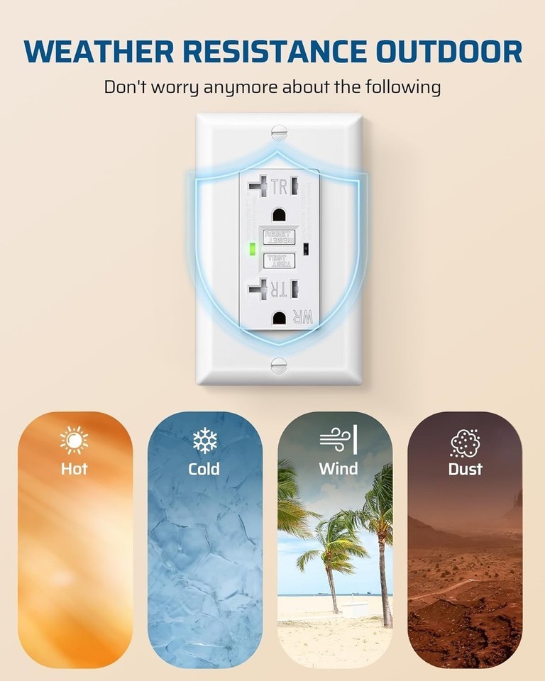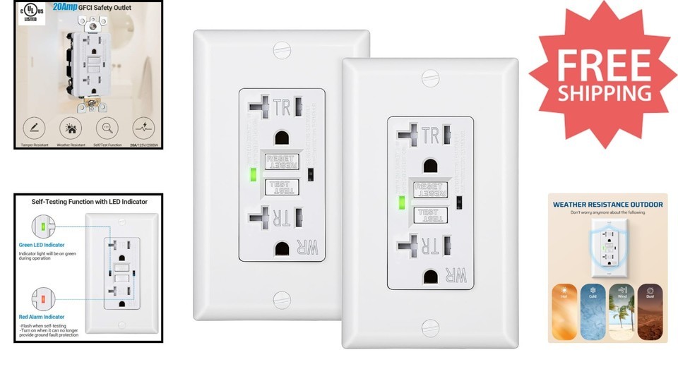 Upgrade your home's safety with our 20AMP GFCI Outlet, designed to continuously protect against ground faults, preventing electrical fires and personal injuries. Features tamper-resistant and weather-resistant construction, making it ideal for indoor and outdoor use such as bathrooms, balconies, and kitchens. Equipped with a self- function that automatically monitors performance every 40 seconds and LED indicator lights?red for end-of-life alert and green for proper operation?ensuring reliable protection at all times. Easy to install with pre-loosened screws and included decor wall plate for a modern look. Keep your home safe and compliant with this essential electrical component. To ensure fast and reliable delivery, we work with multiple fulfillment partners and suppliers. Depending on availability and location, your order may ship from different warehouses or arrive in packaging that varies from item to item. Tracking details are typically provided shortly after shipment, and customer satisfaction remains our top priority. Please note that due to carrier policies and regional regulations, certain items may not be eligible for delivery to specific states or territories.