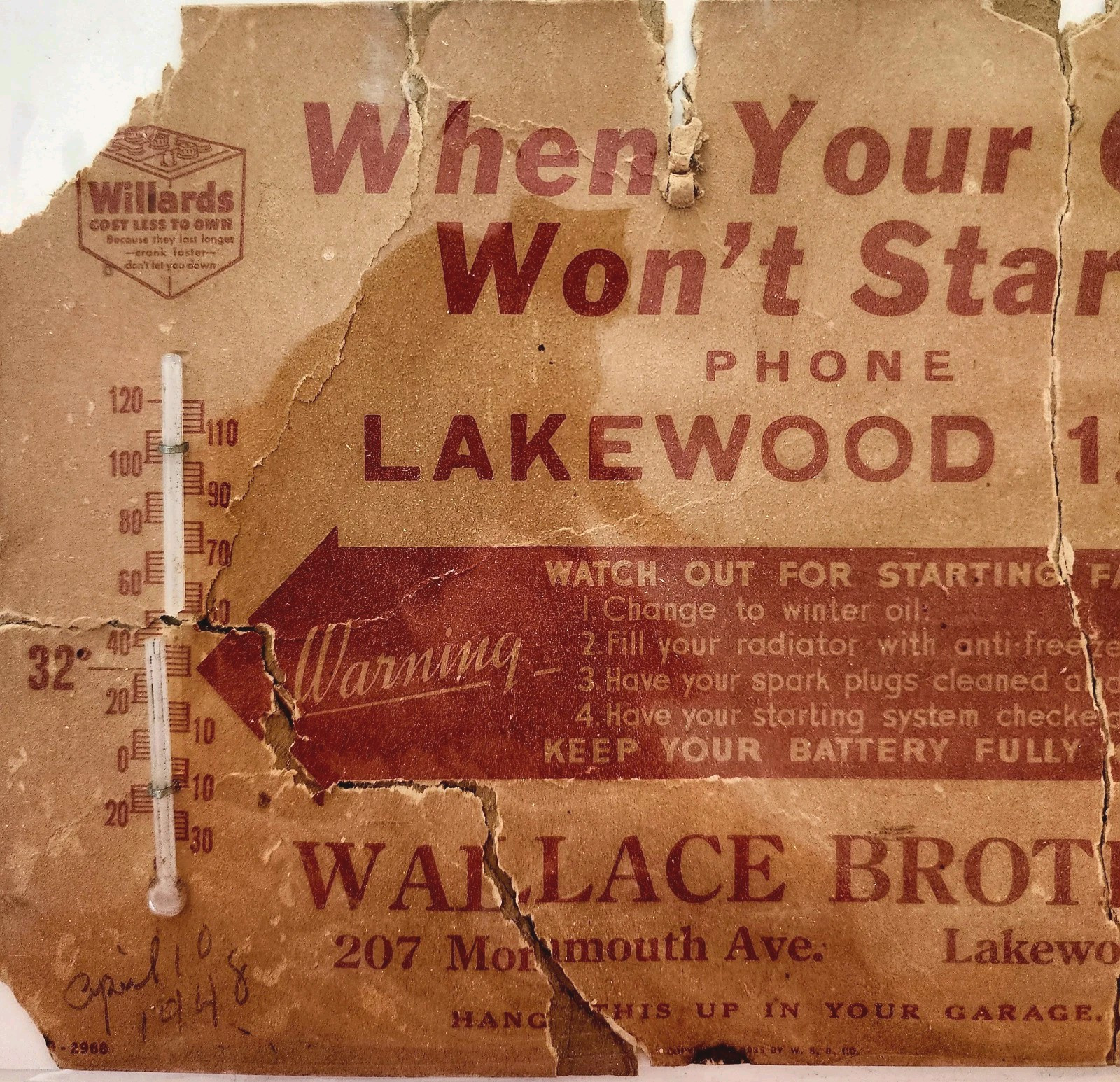 1948 Wallace Brothers Garage Advertisement Thermometer Sign Lakewood NJ DWRR3