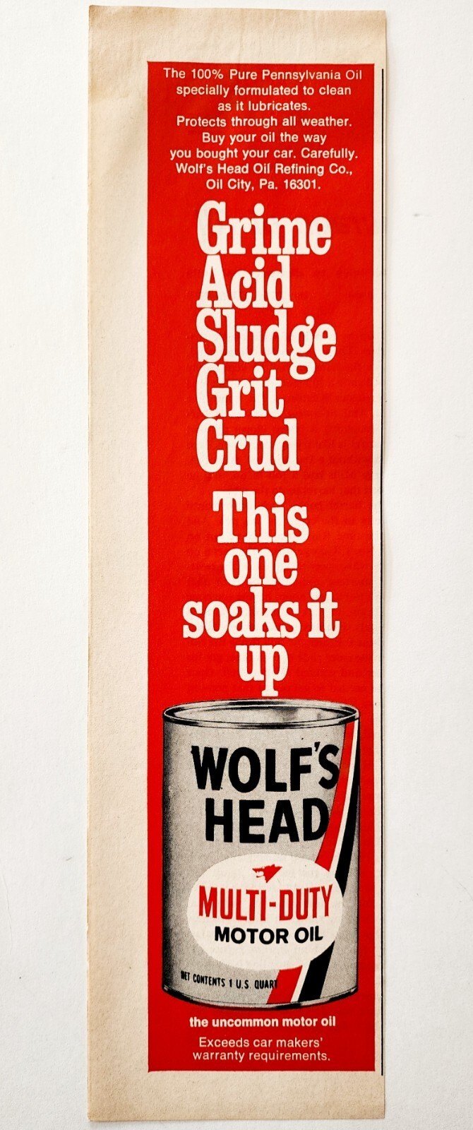 1971 Wolf's Head Motor Oil Advertisement Automobilia Pure Pennsylvania DWF11