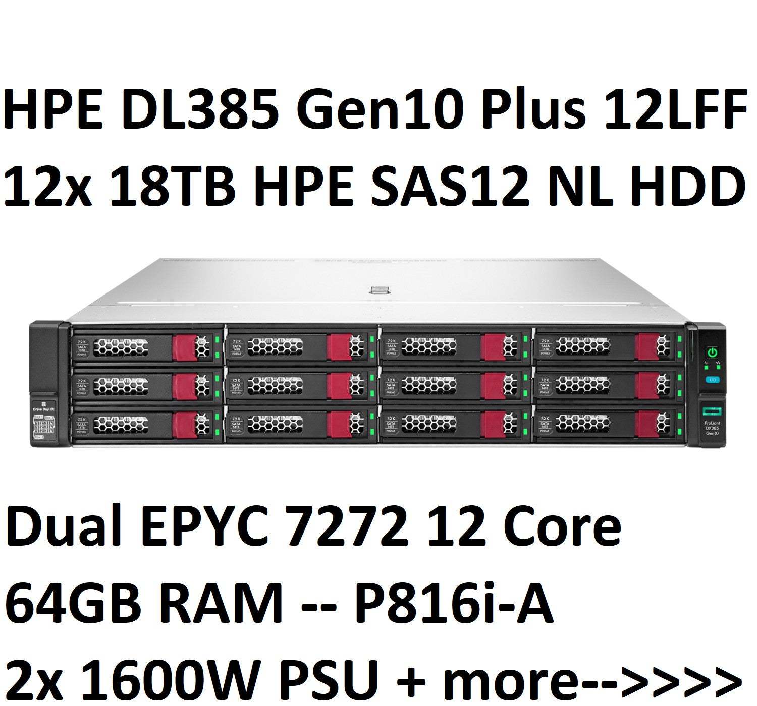 HPE DL385 Gen10 Plus 216TB HDD 2x AMD EPYC 7272 64GB 2x 1600W 10GbE 25GE P816i-a