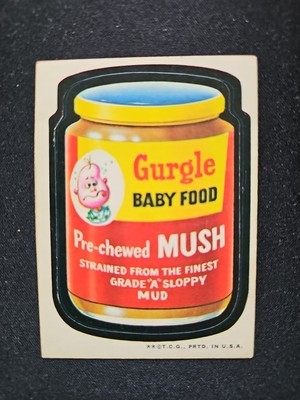 UP FOR SALE: Original GURGLE Baby Food sticker from the 2nd Series of Topps Wacky Packages, released in 1973. Parodying Gerber baby food, this sticker proudly advertises "Pre-chewed MUSH strained from the finest Grade ?A? sloppy mud.?