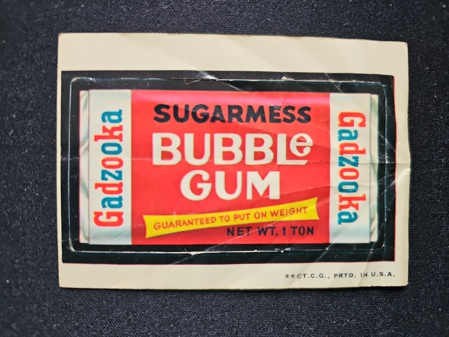 UP FOR SALE: Original Sugarmess Bubble Gum sticker from the 1973 Topps Wacky Packages 2nd Series. A parody of Bazooka gum (aka Gadzooka here), this vintage die-cut sticker boasts a bold label: