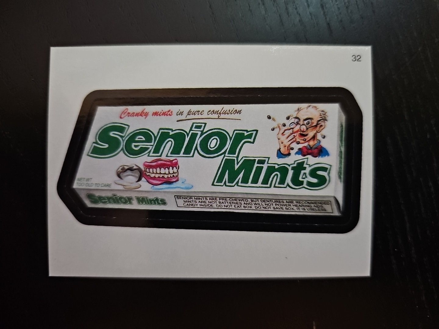 UP FOR SALE: Senior Mints ? "Carefully made in parts" and hilariously geriatric. This parody of Junior Mints is classic 2005 Wacky Packages humor, and the dentures on the label