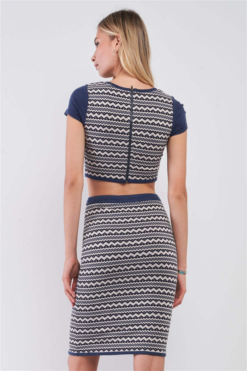 Navy White Geometrical Pattern Short Sleeve Crop Top High-waisted Pencil Skirt Two Piece Set